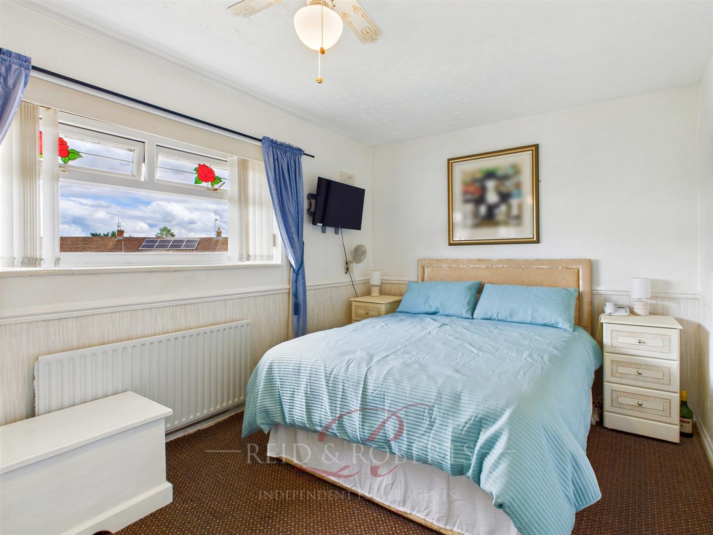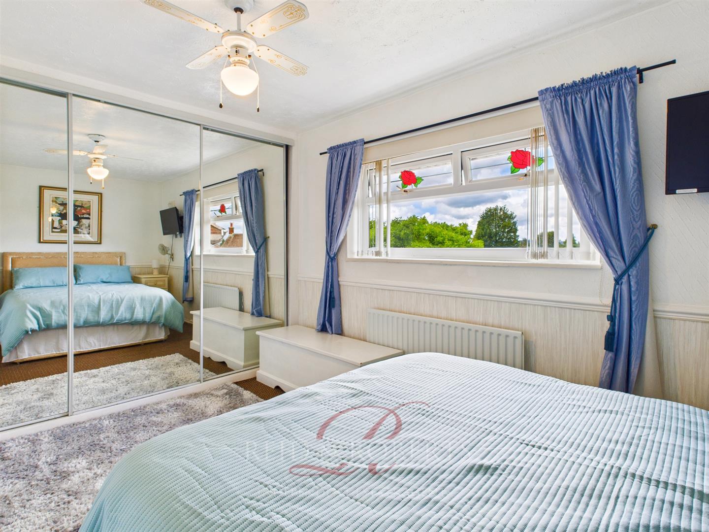 Well proportioned bedroom with UPVC double glazed window overlooking the rear garden, radiator below, full-width mirrored fitted wardrobes, dado rail, ceiling light point and ceiling fan.