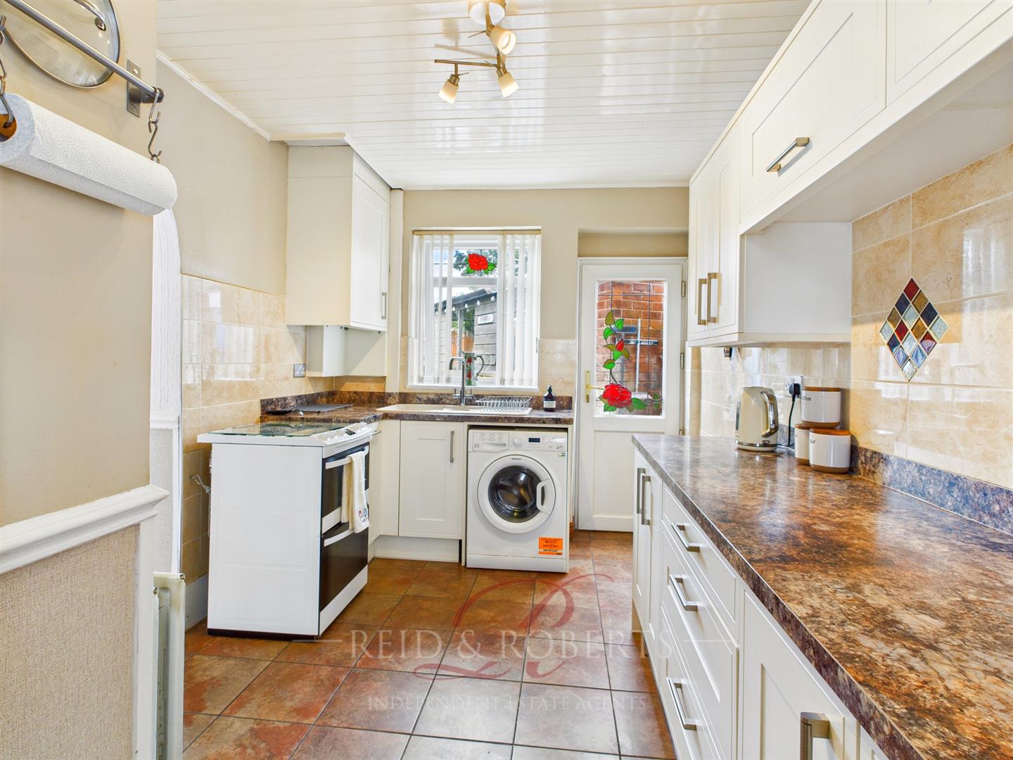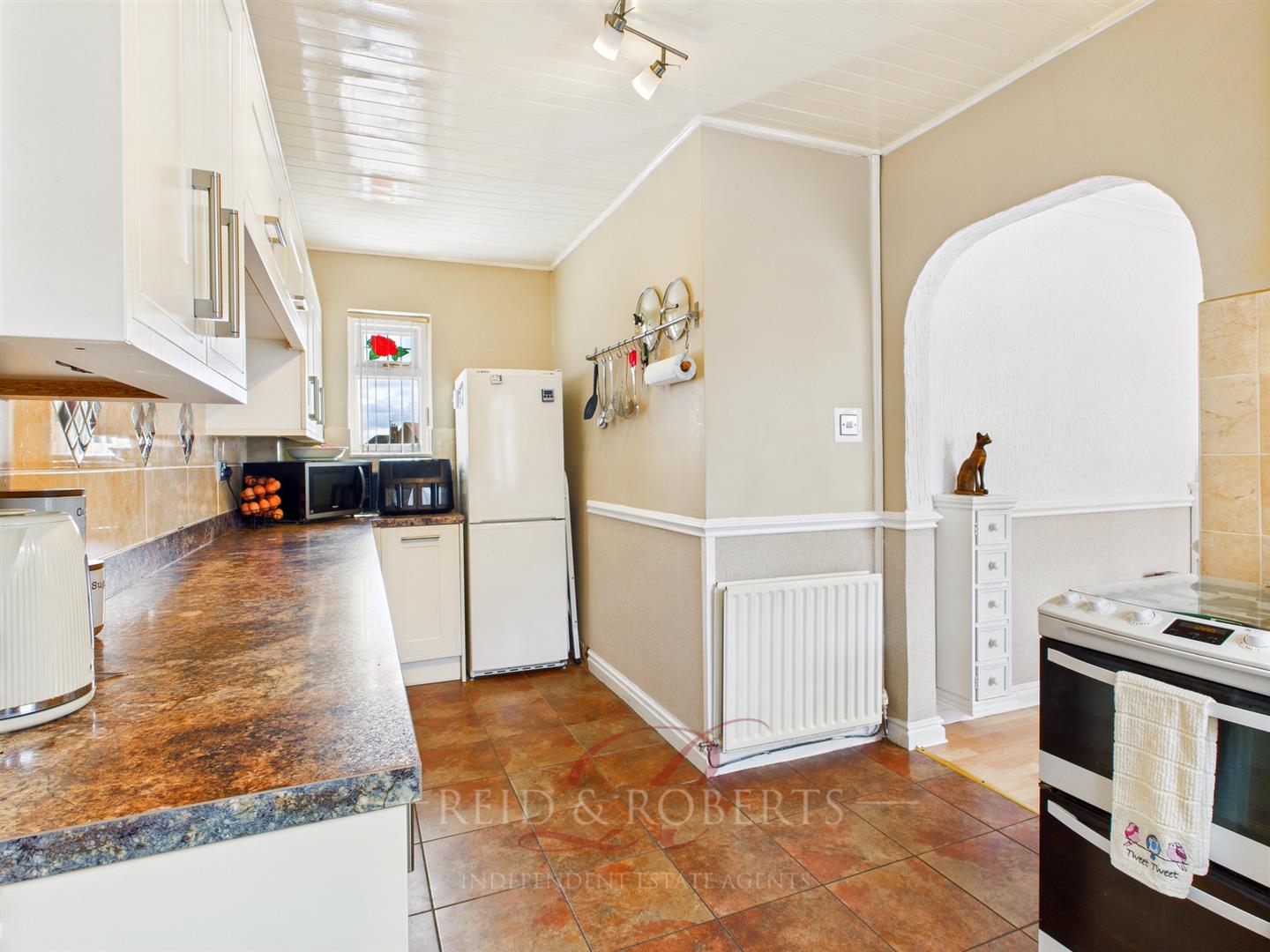 Fitted with a range of shaker-style wall, base, and drawer units with contrasting granite-effect work surfaces and tiled splashbacks. Composite one and a half sink unit with drainer and mixer tap. Space for a dual fuel cooker, washing machine, and tall fridge/freezer. Rose-style UPVC double glazed windows to both the front and rear elevation and matching UPVC door providing direct access to the garden. Wall-mounted concealed Worcester gas boiler. Finished with a tiled floor, wood panelled ceiling, dado rail and ceiling light point.