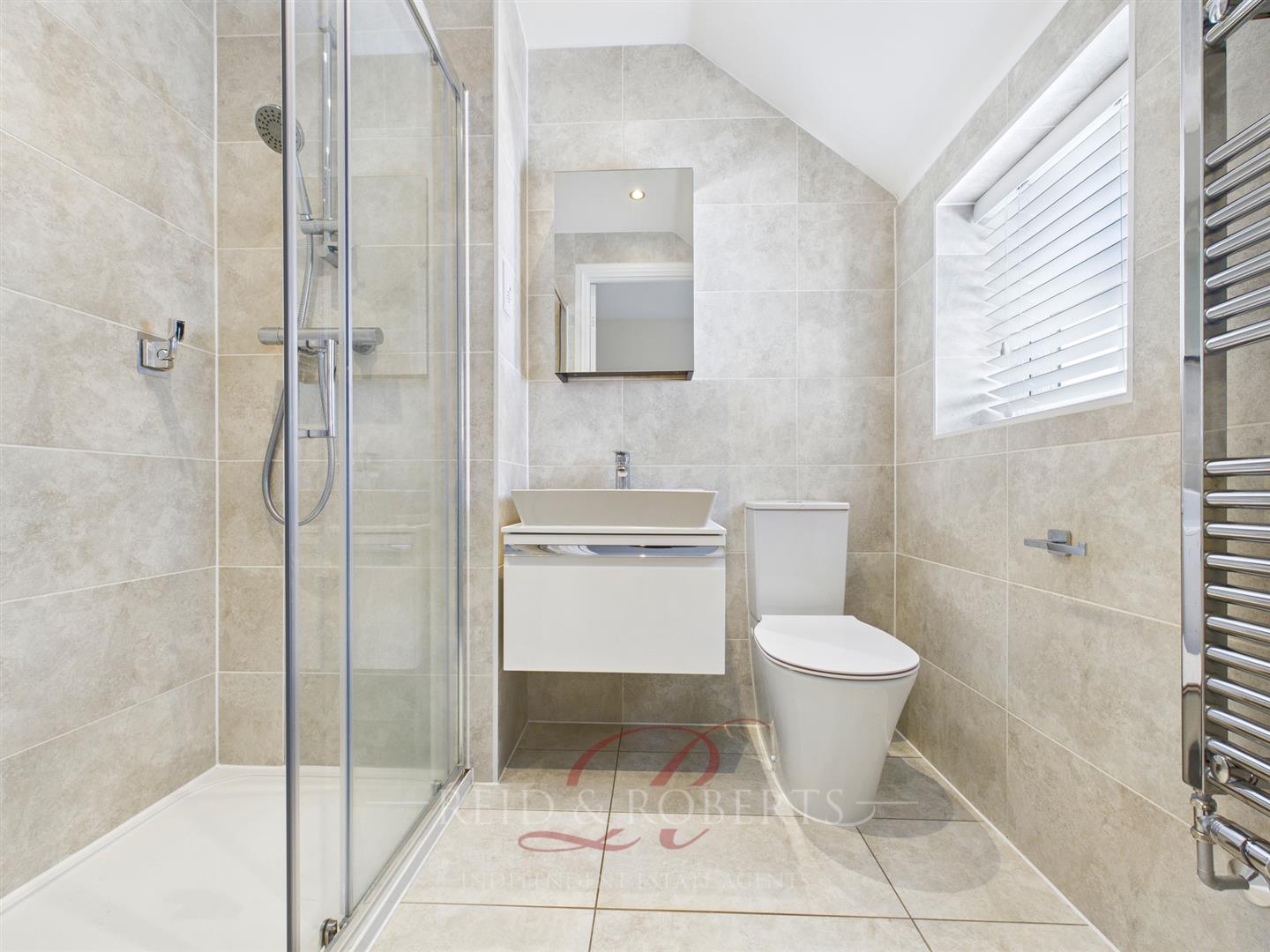 A well designed space with a double shower cubicle with glazed sliding screen, low-level WC, wall-mounted vanity wash hand basin, tiled splashbacks, extractor fan, radiator, and frosted uPVC double glazed window to front elevation.