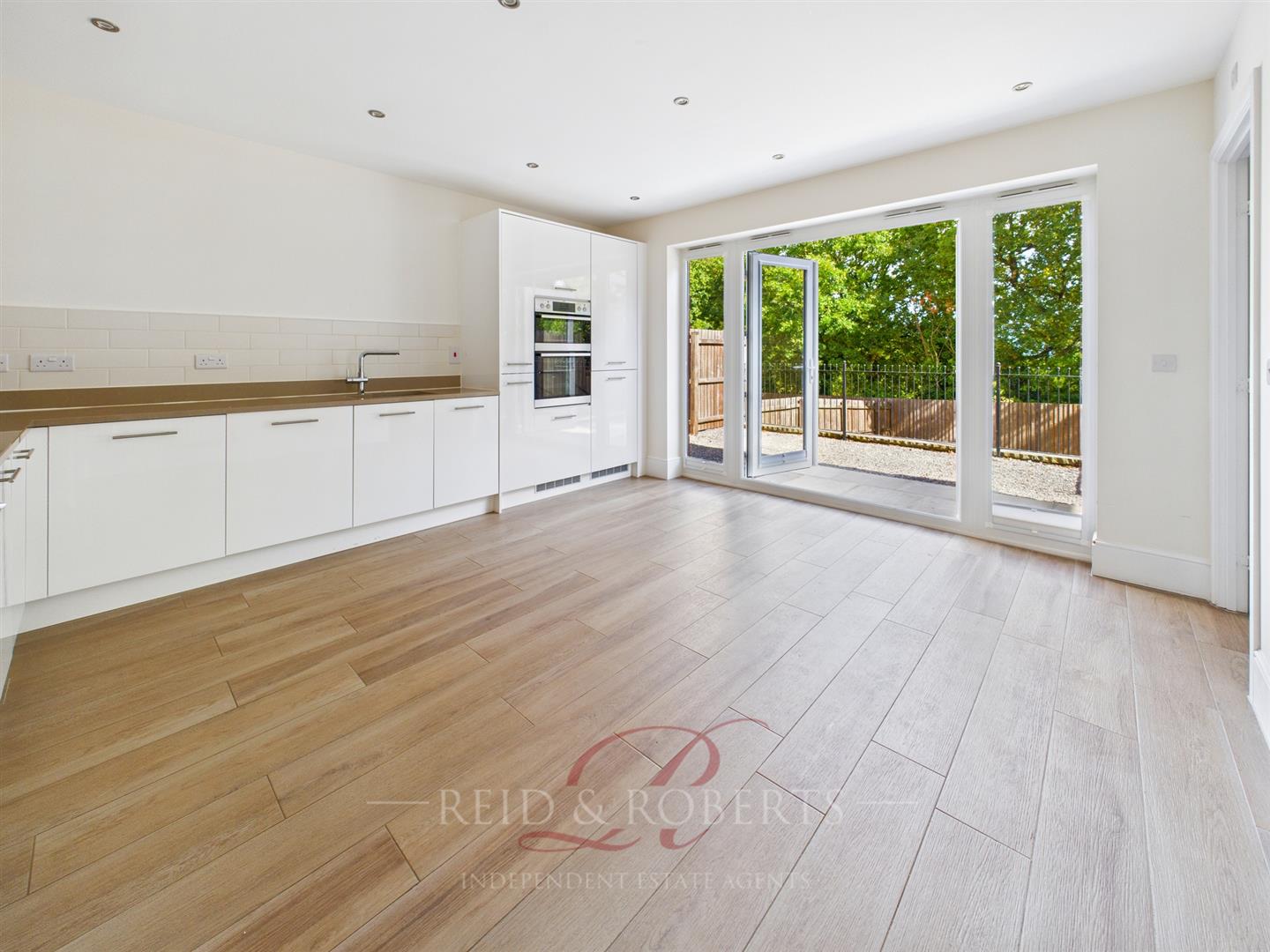 A modern and well presented kitchen that is fitted with a range of wall, base, and drawer units with complementary worktops and tiled splashbacks. Integrated oven, hob, and extractor hood, with further integrated appliances. Inset stainless steel sink unit with mixer tap. uPVC double glazed window to rear elevation and French doors to rear garden. Panelled radiator, tiled flooring, ample space for dining furniture.
