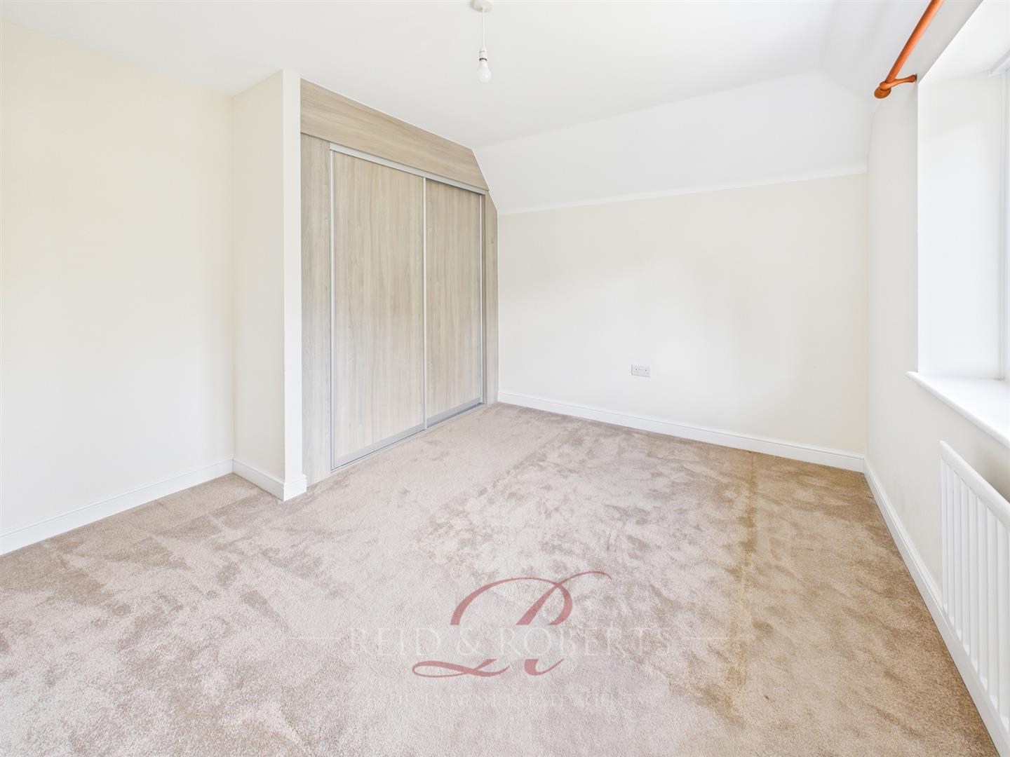 Double bedroom with front-facing uPVC double glazed window, panelled radiator, fitted wardrobes, and multiple power points.