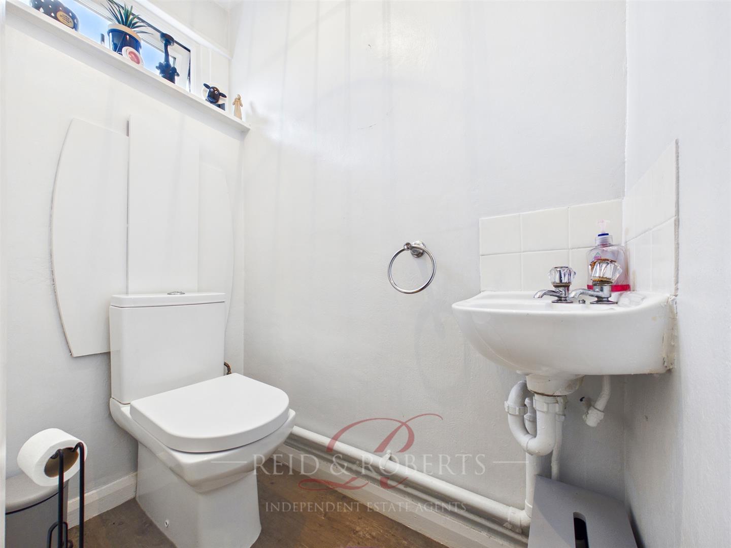 Fitted with a low flush WC and corner floating wash hand basin with mixer tap, complemented by splashback tiling, wood effect flooring, central ceiling light point, and a frosted UPVC double glazed window to the front elevation.