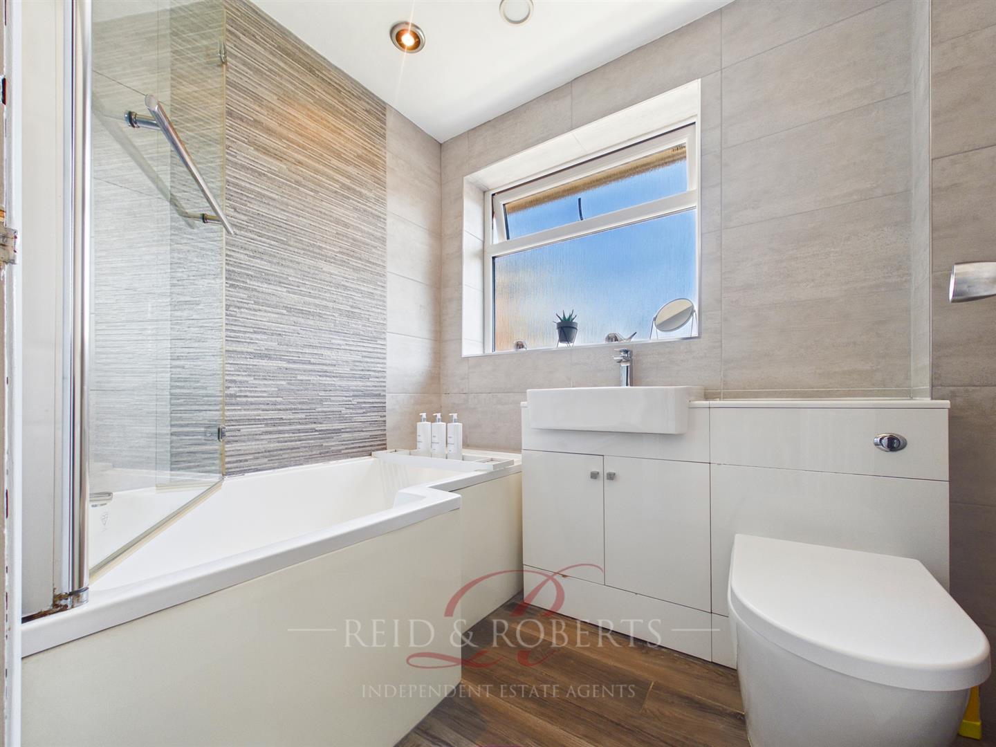 Appointed with a three-piece suite comprising a P-shaped panelled bath with mixer tap and mains powered shower over, including handheld attachment. Fully tiled walls, recessed spotlighting, low flush WC, and wash hand basin set within a vanity unit providing useful storage. Finished with wood effect flooring and a frosted UPVC double glazed window to the rear elevation.
