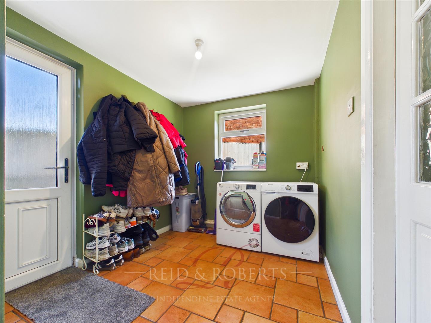 With continuation of tiled flooring, space and plumbing for washing machine and tumble dryer, central ceiling light point, UPVC double glazed window to the rear, and UPVC door with frosted inset providing access to the rear garden.