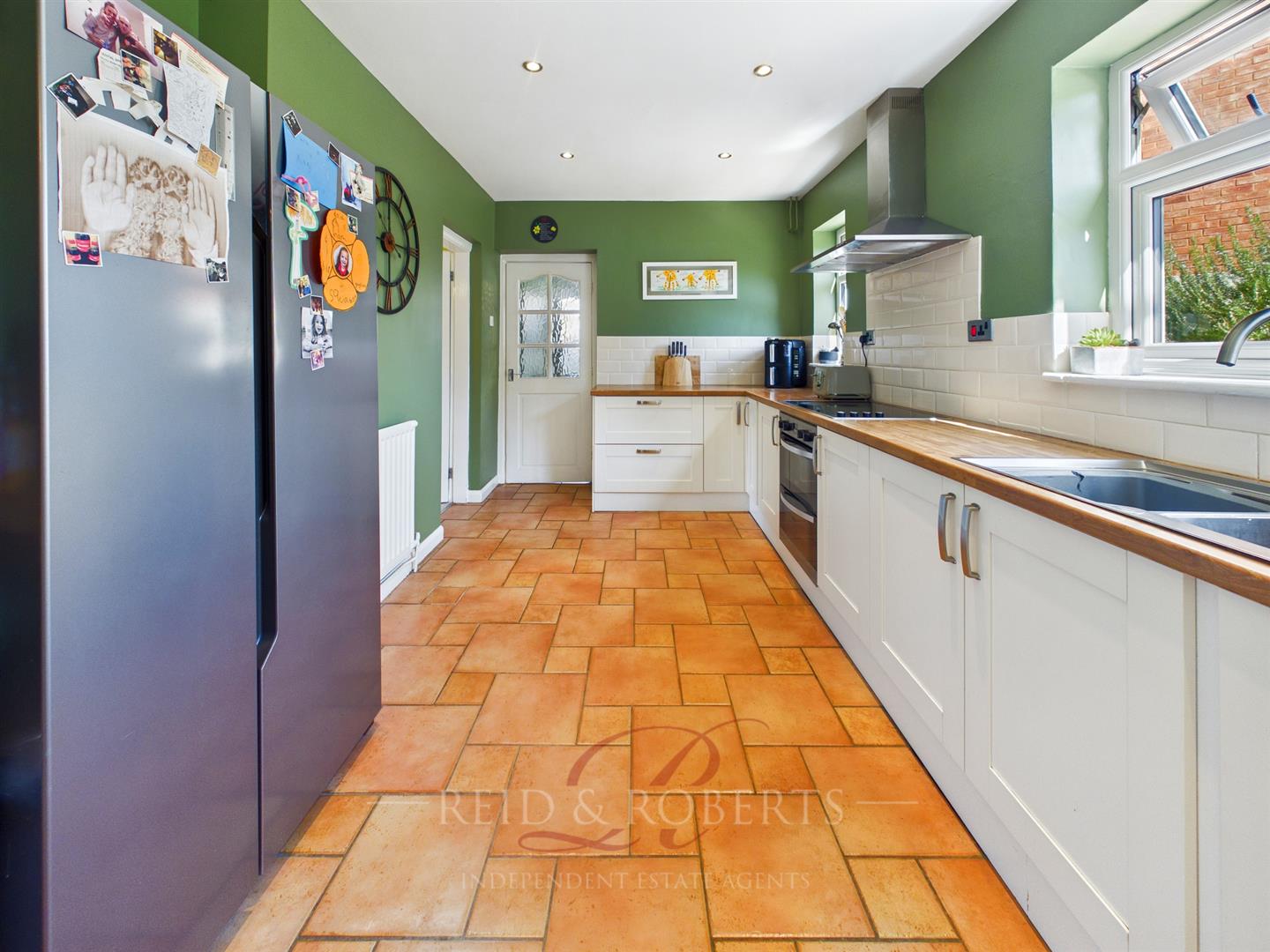 Fitted with a range of wall, base and drawer units with wood effect work surfaces and tiled splashbacks. Incorporating an electric oven with Bosch four ring induction hob and stainless steel extractor hood over, one and a half bowl stainless steel sink unit with drainer and mixer tap, and integrated dishwasher. Additional features include tiled flooring, recessed spotlights, space for an American style fridge freezer, and UPVC double glazed windows to the rear elevation. Doors lead to the utility room and additional reception room.