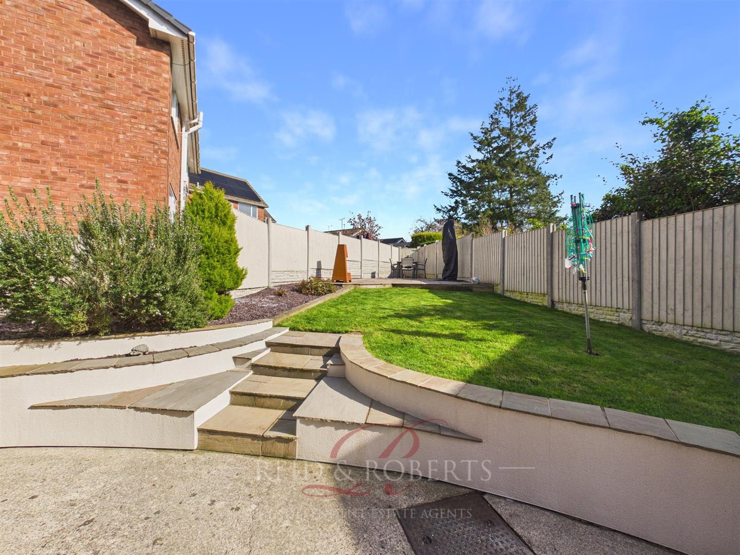 To the rear, the property boasts a beautifully landscaped and south-facing garden, designed for both relaxation and entertaining. Featuring an Indian stone patio area with slate chipped borders, steps leading up to a well-maintained lawn, and an additional seating area. The garden is fully enclosed with timber fencing, ensuring a high degree of privacy and security.