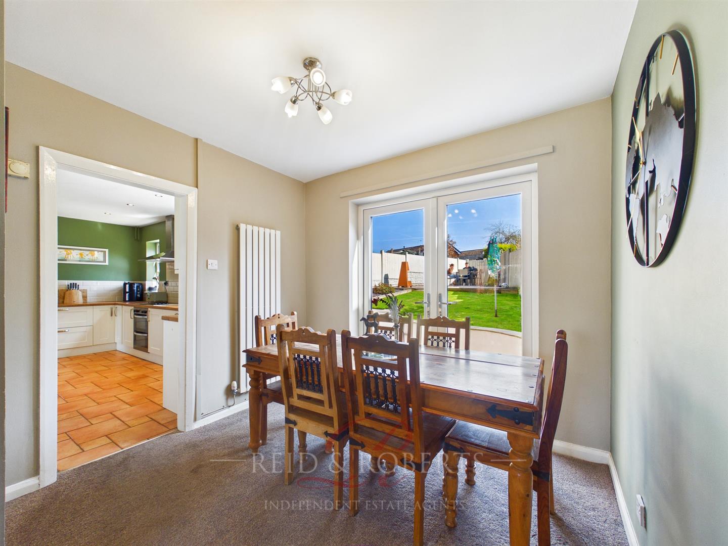 A well-proportioned space ideal for family dining and entertaining, with central ceiling light point, modern vertical radiator, wall mounted thermostat, and UPVC double glazed patio doors opening onto the south-facing rear garden.