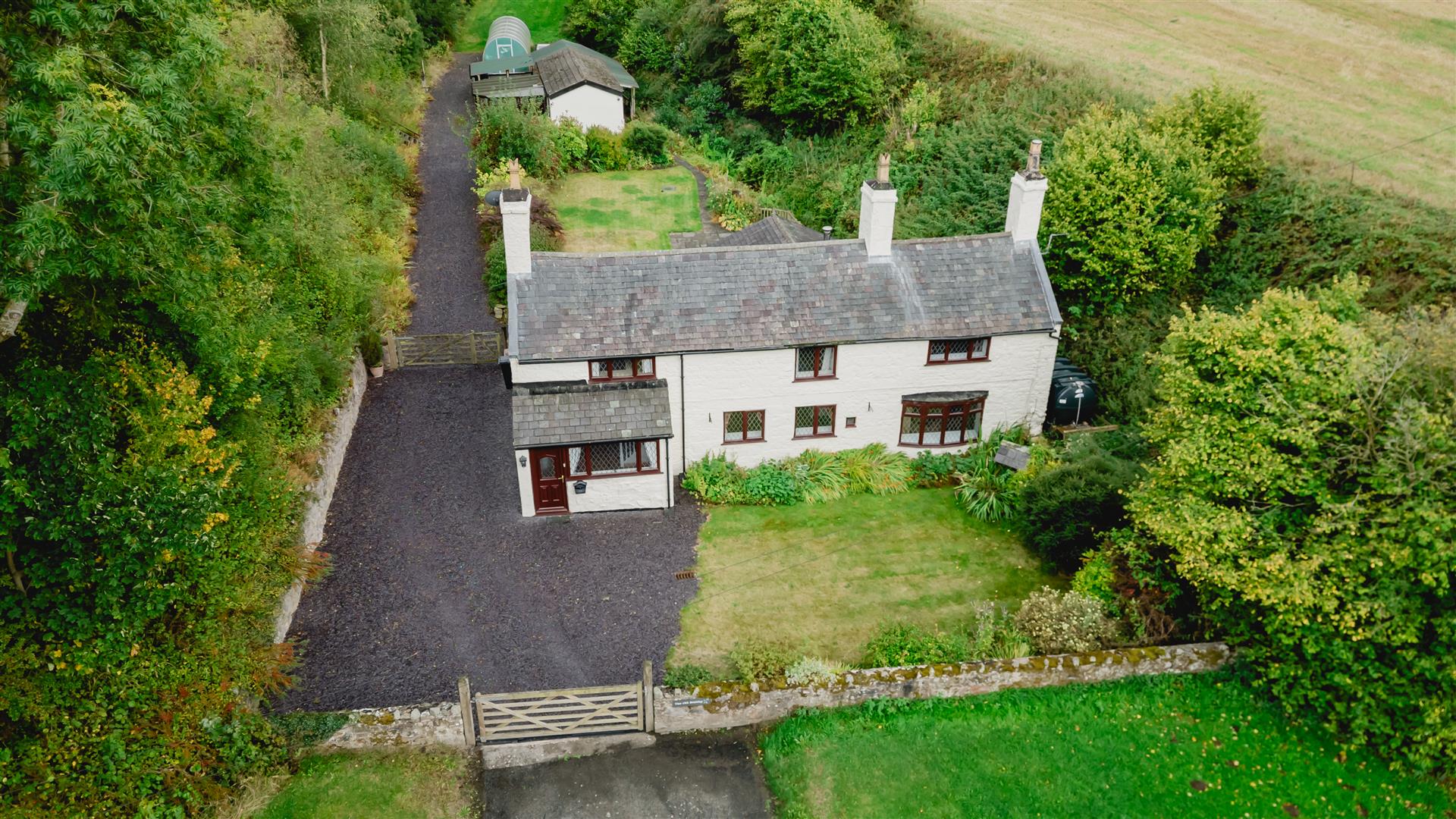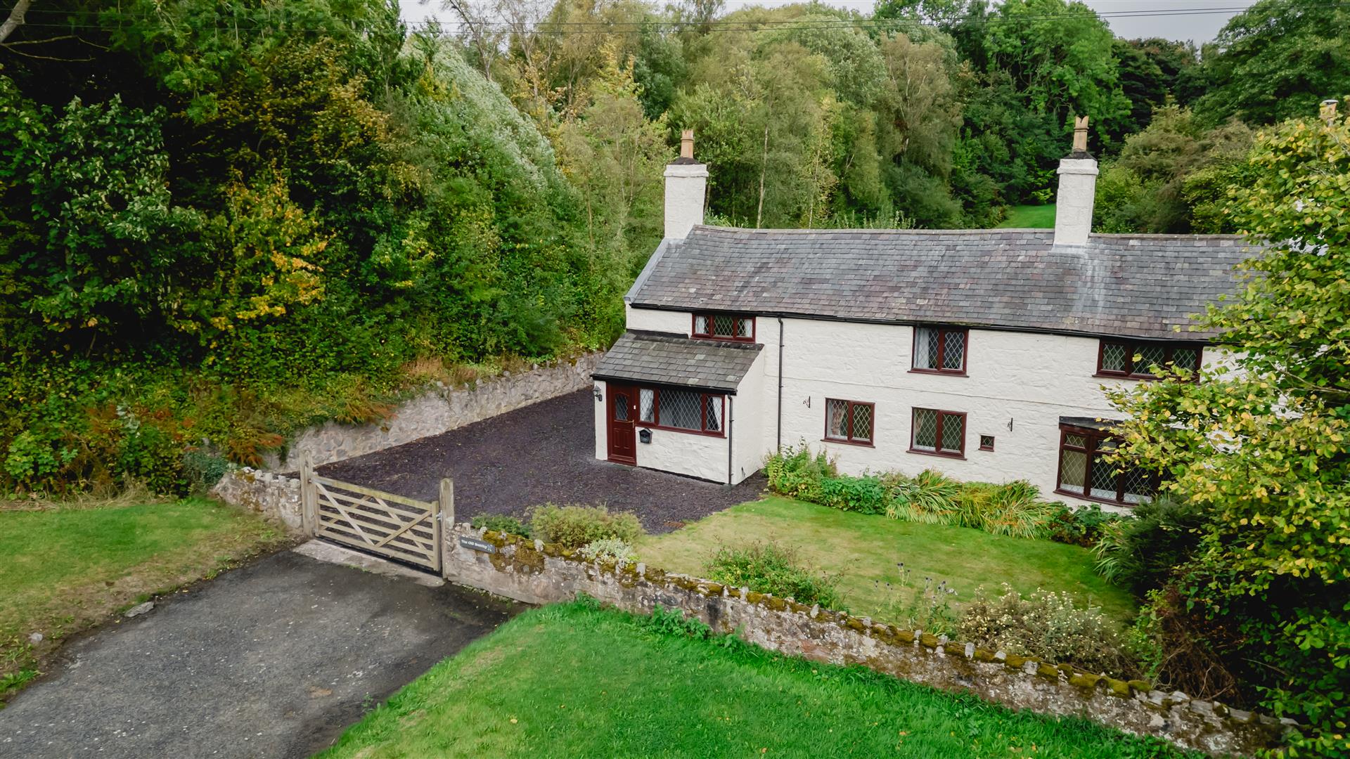 The outdoor space at this property is as enchanting and characterful as the home itself. To the front, a manicured lawn is bordered by mature plants and established shrubbery, offering a peaceful and picturesque entrance. A charming stream meanders beneath the property, enhancing the tranquil, countryside ambience and adding a unique feature to the setting.