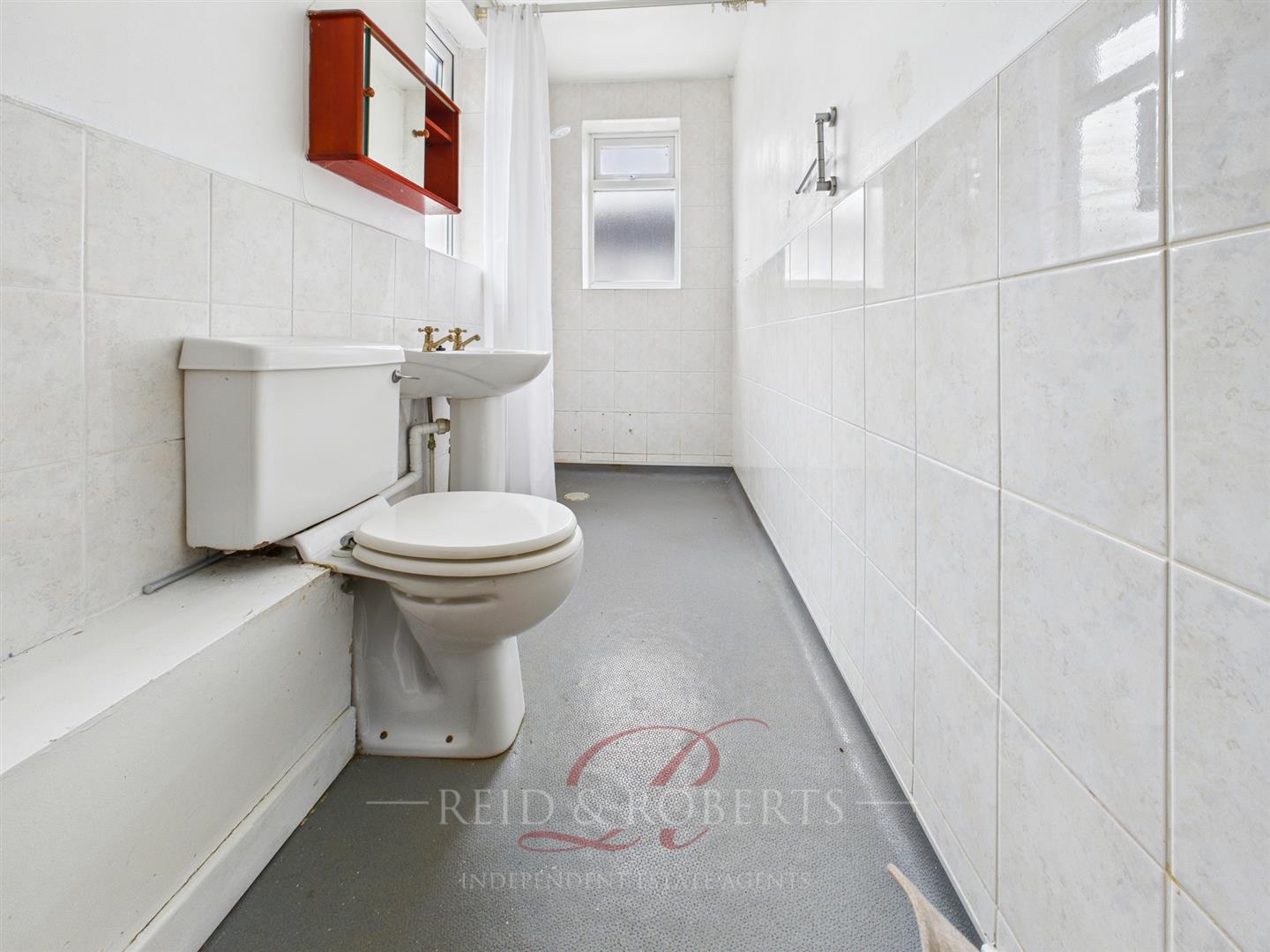 Low-flush WC, wall-mounted wash hand basin, splashback tiling, and UPVC frosted window with top opener to the rear elevation.