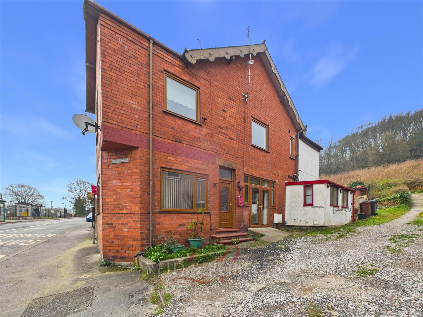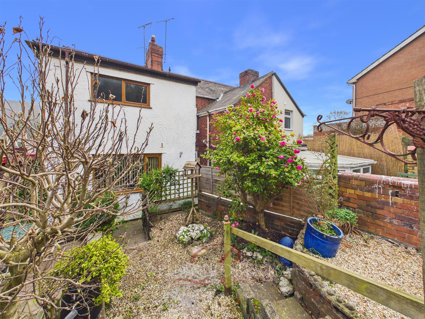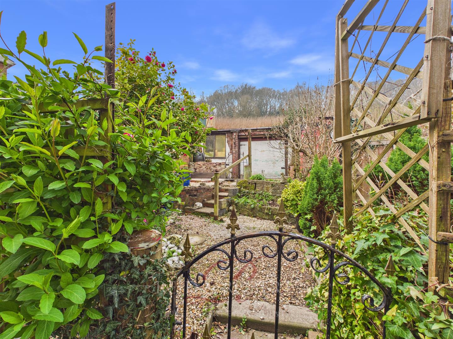 To the front of the property there is off road parking on a gravelled area, with the driveway continuing to the rear. The rear garden is designed for low maintenance, featuring pebbled areas and a patio seating area, ideal for outdoor use. A mature tree adds character, with steps leading up to a garage/workshop, providing useful additional storage or workspace.