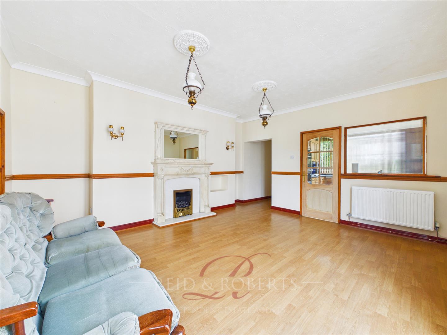 Double glazed windows to the side elevation along with double glazed French doors allowing plenty of natural light and access to the outside. Featuring wood-effect laminate flooring, two double panelled radiators, and a coal effect gas fire set on a marble hearth. The room also benefits from a useful recessed area offering potential for storage or pantry use, or scope to open into the adjoining kitchen (subject to requirements). An opening with steps leads down to Reception Room Two and under stairs storage.