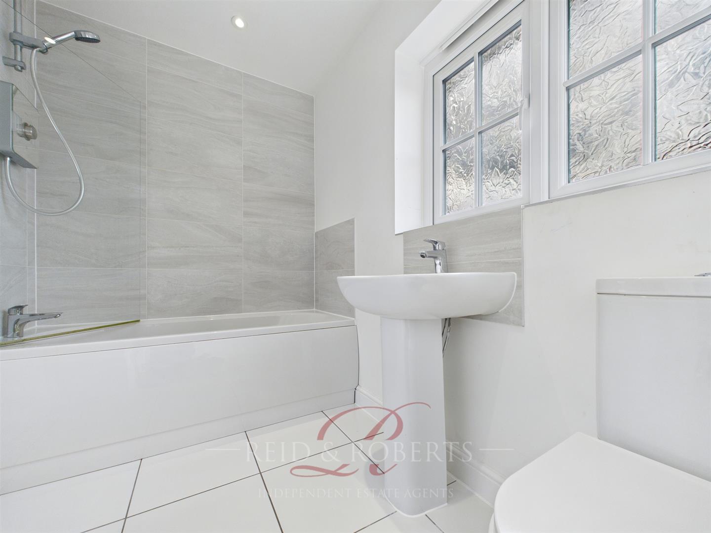 The stylish family bathroom features a modern three piece suite comprising of a panelled bath with electric shower and handset over, low level WC, and a wash hand basin with mixer tap. The space is finished with tiled flooring, marble effect splashbacks, recessed spotlights, a heated towel rail, and a frosted UPVC window.