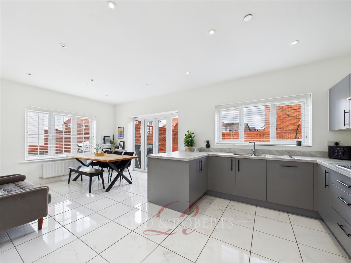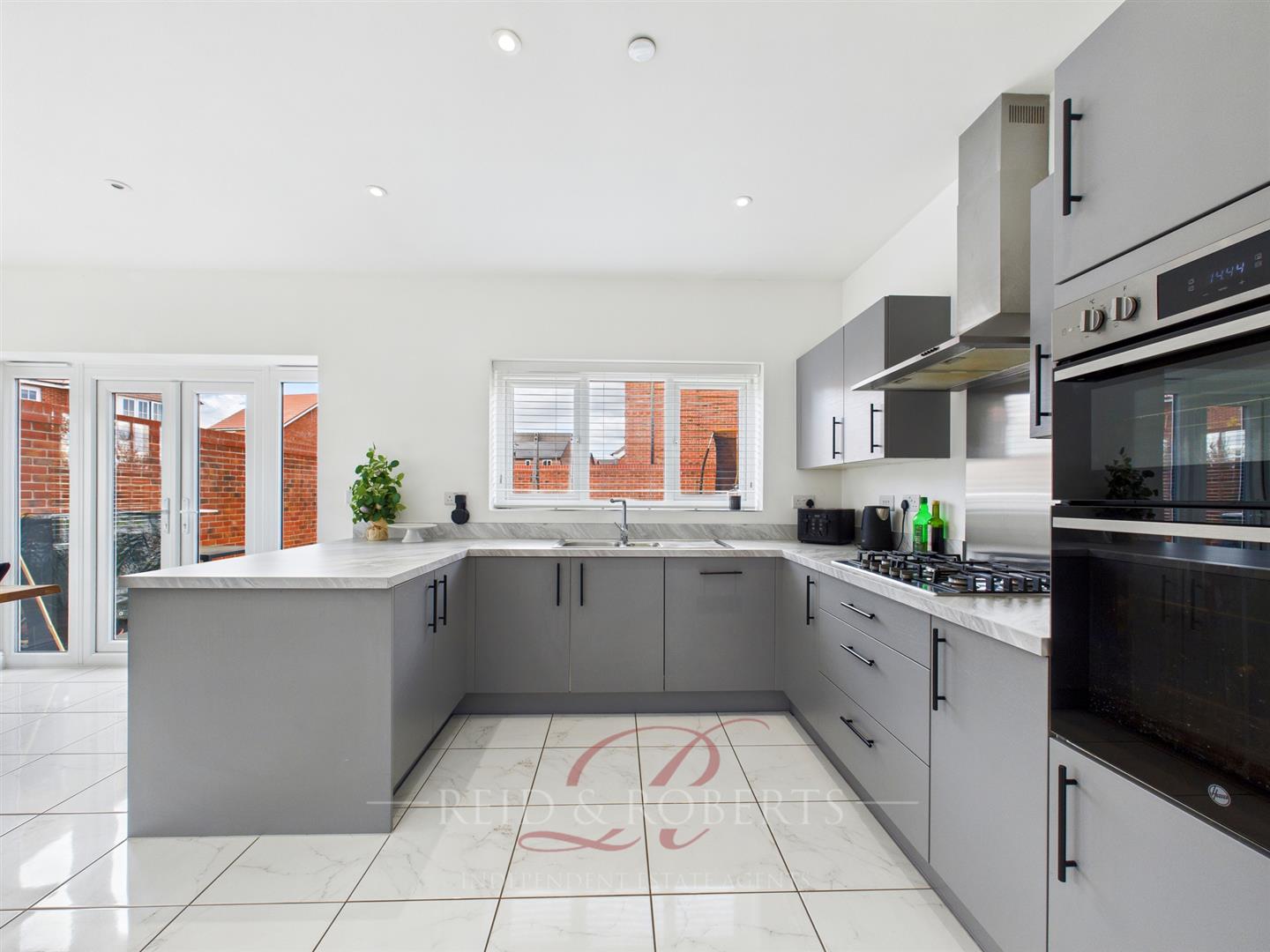 At the heart of the home lies a truly impressive open plan kitchen and dining area, designed for modern living and effortless entertaining. The space features marble effect flooring, sleek high gloss cabinetry, and a range of premium integrated appliances including a five ring gas range hob, stainless steel extractor, double oven, fridge freezer, and full size dishwasher. Elegant marble effect worktops and splashbacks complement the contemporary aesthetic, while a central breakfast bar offers a stylish casual dining solution. Patio doors open directly onto the paved terrace and lawned garden, ideal for al fresco dining and enjoying the peaceful surroundings.