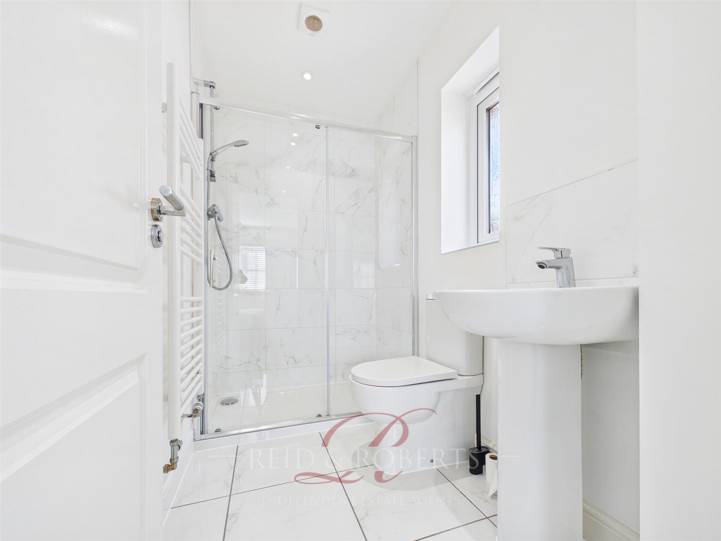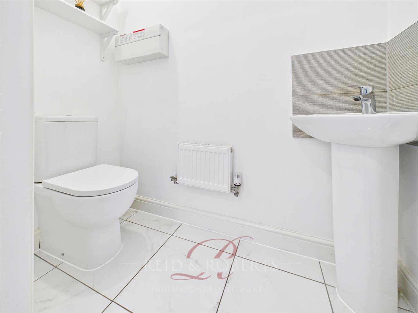 The ground floor benefits from a modern cloakroom, finished with marble effect flooring, a contemporary wash hand basin, low level WC, and radiator. ideal for guests and day to day convenience.