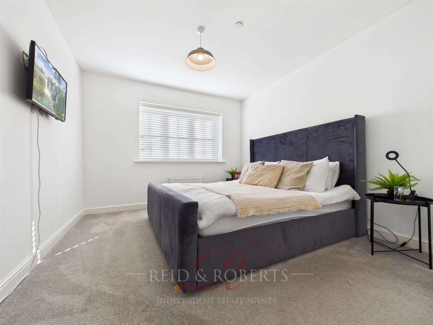 A beautifully proportioned double bedroom, filled with natural light and complete with Venetian blinds, radiator, thermostat, and TV point.