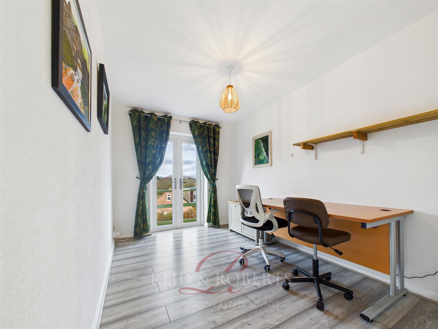 This multi-purpose room can be utilised as a dining room, home office, a snug or third bedroom, making it versatile for a variety of lifestyle needs. Generous natural light floods in through the UPVC double-glazed French doors, which open onto a raised deck overlooking the rear garden and offer attractive views, whilst enhancing indoor outdoor living. The space is complete with wood-effect laminate flooring, neutral finishes, USB-enabled power points and ceiling light.