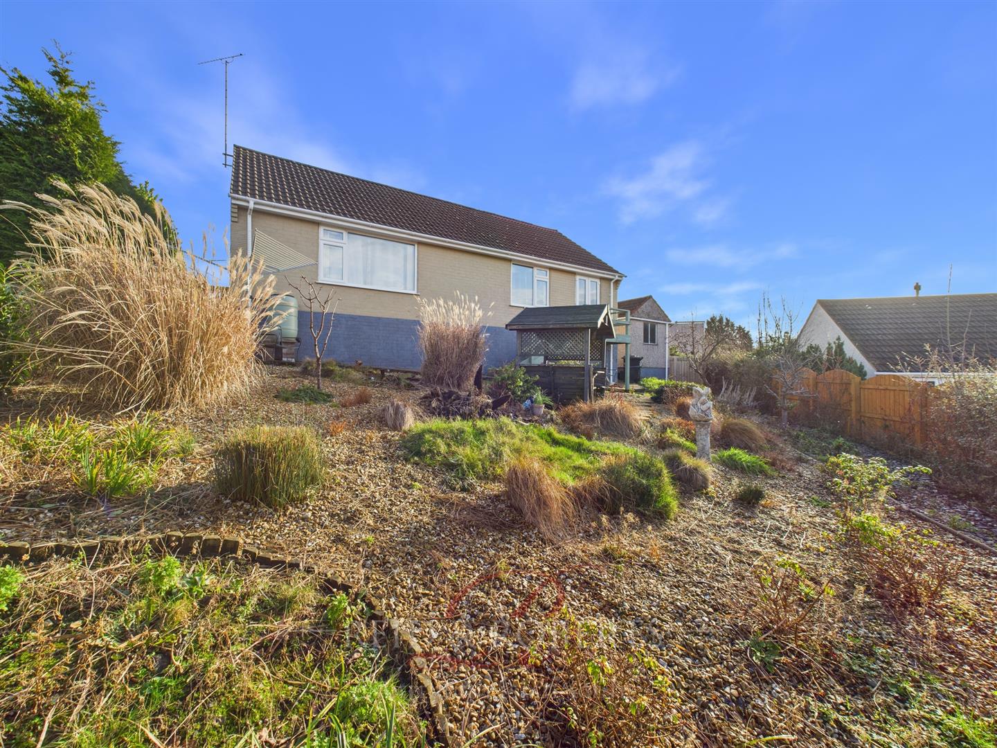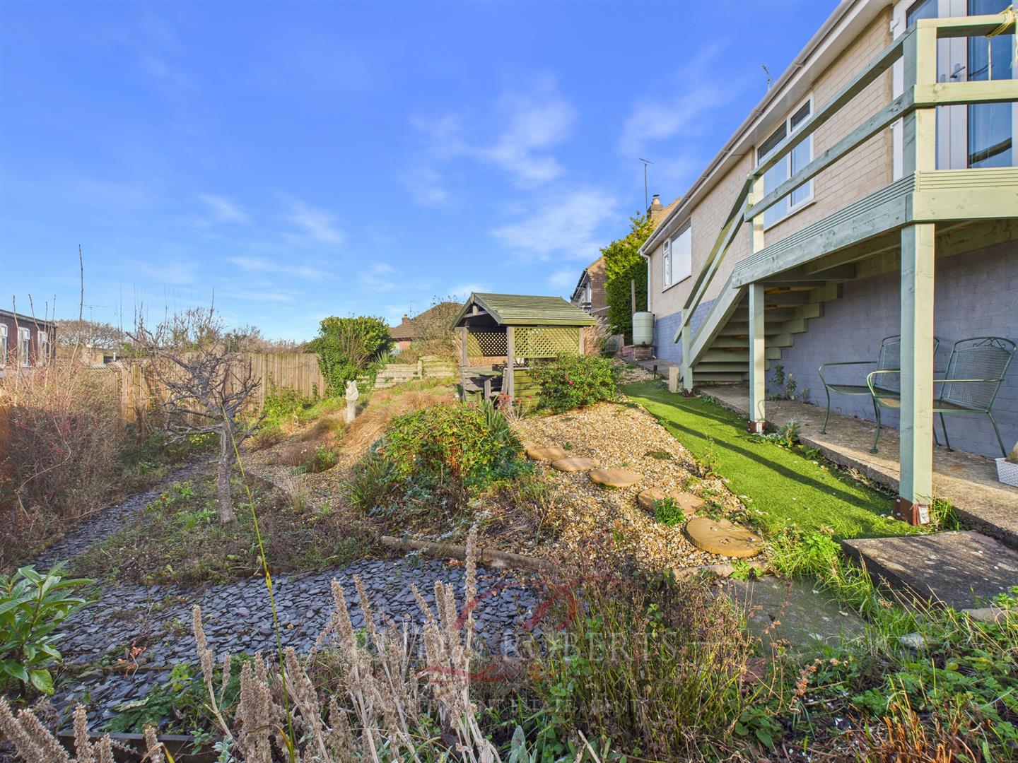 The front of the property has been designed with low maintenance in mind, featuring gravelled areas bordered by mature hedging and boundary walls. A paved driveway offers off-road parking and leads to the detached garage. The side elevation is enhanced by a charming wildflower bed, adding seasonal colour. Steps lead up to the main entrance.