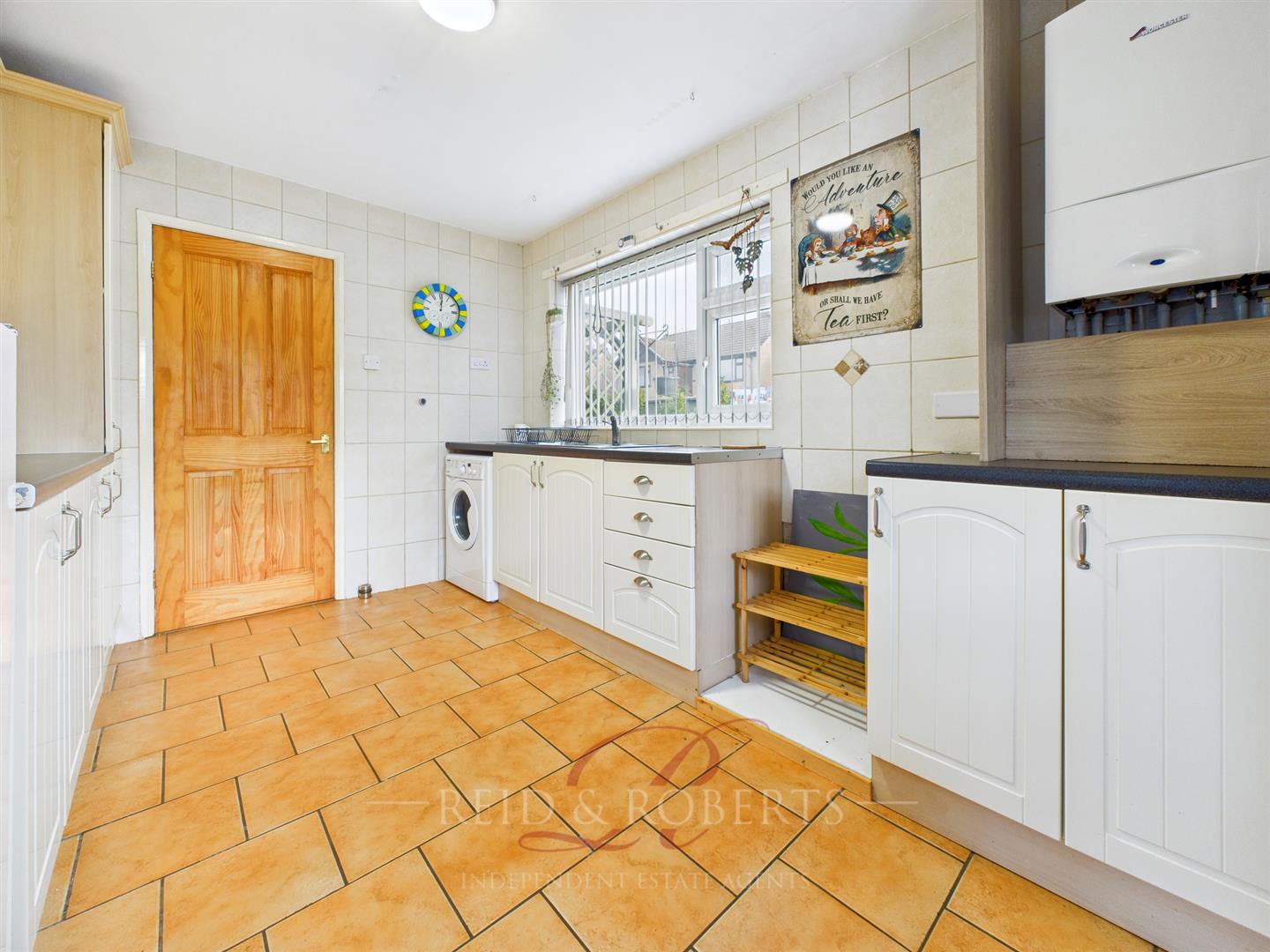 A practical enclosed area accessed from the driveway via a UPVC door with decorative glazing or internally from the kitchen, offering useful space for additional white goods and houses the fuse box. The space is made up of UPVC double-glazed windows sat upon PVC panels, providing ample natural light, tiled flooring and ceiling light.