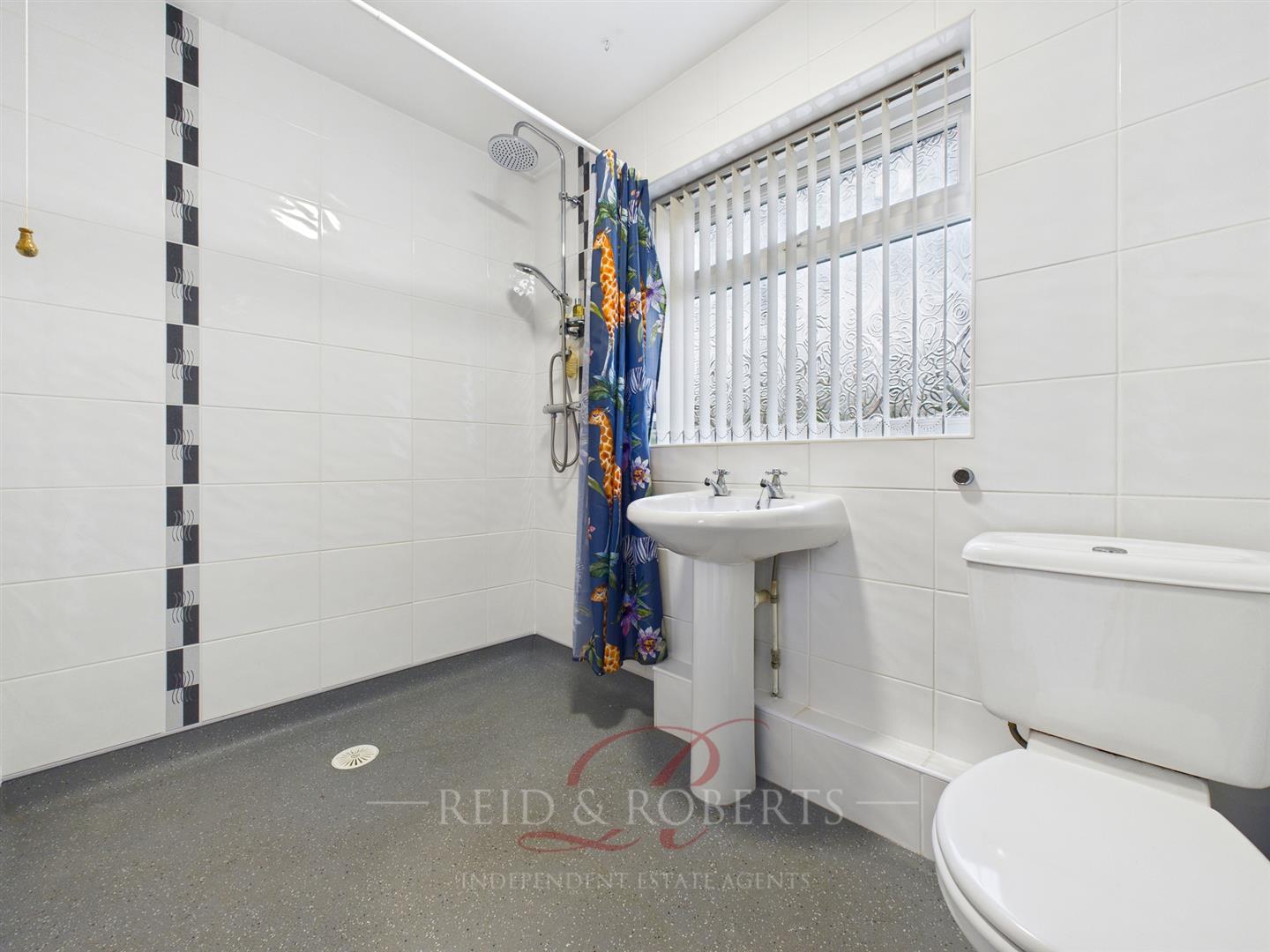 The wet room includes a mains-powered shower with an adjustable handset above, pedestal sink with taps and W.C. The walls are fully tiled and suitably includes slip-resistant flooring throughout, ensuring safe use for all. Features a panelled radiator, ceiling light and a UPVC double-glazed frosted window for ventilation and privacy.