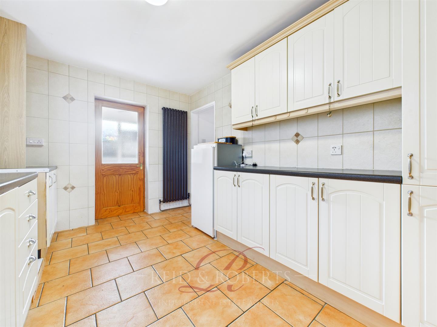 The kitchen is fitted with a range of wall and base units with soft-close drawers, offering ample storage, paired with a complementary worktop surface. A stainless-steel sink sits beneath a UPVC double-glazed window to the front elevation, with space for a cooker, washing machine and fridge freezer. A sleek vertical radiator and USB-enabled power points add a modern touch, with additional features including fully-tiled walls and flooring. A wooden door with a glazed inset connects to the side porch, with a further doorway leading into the second reception room.