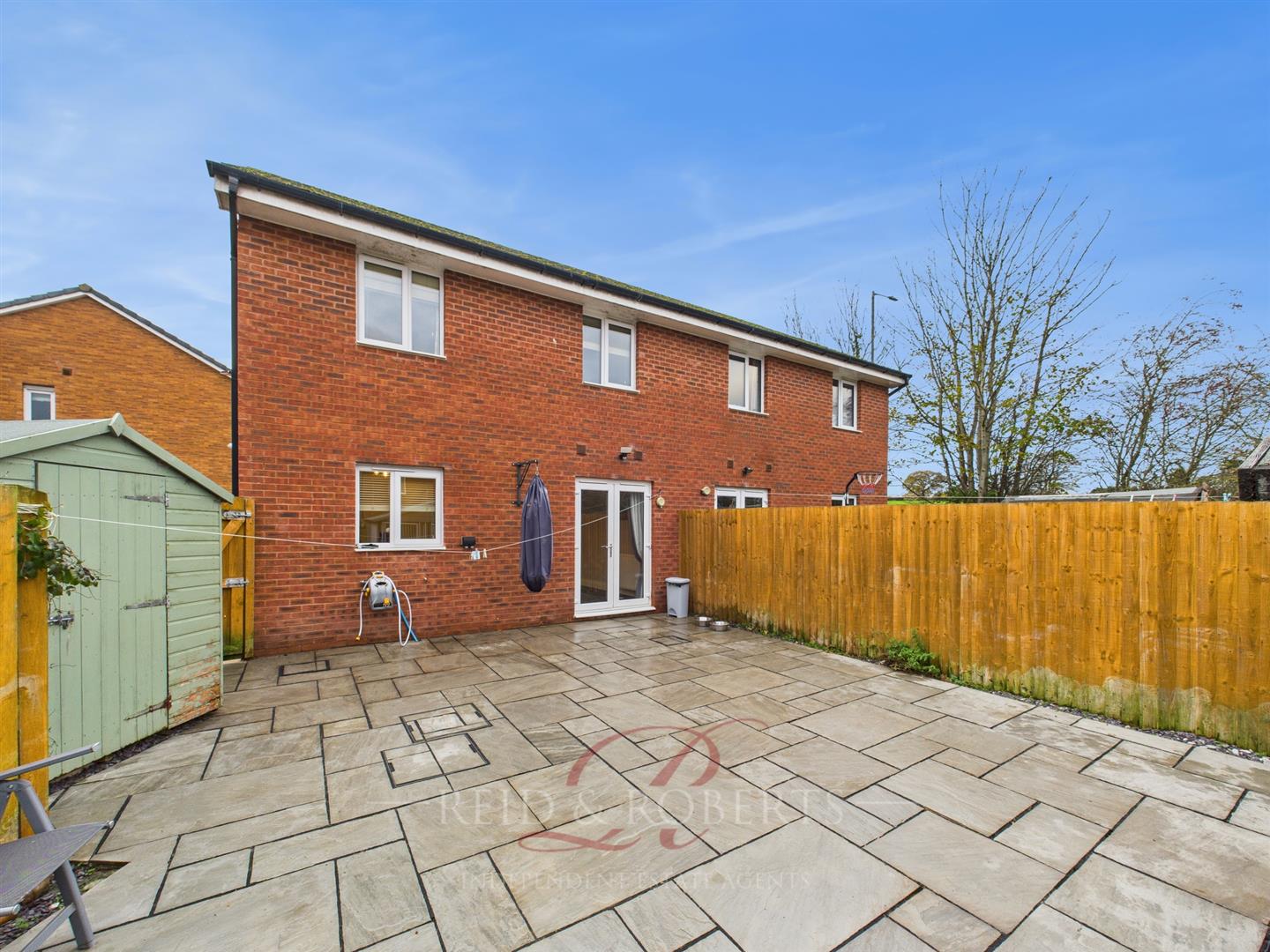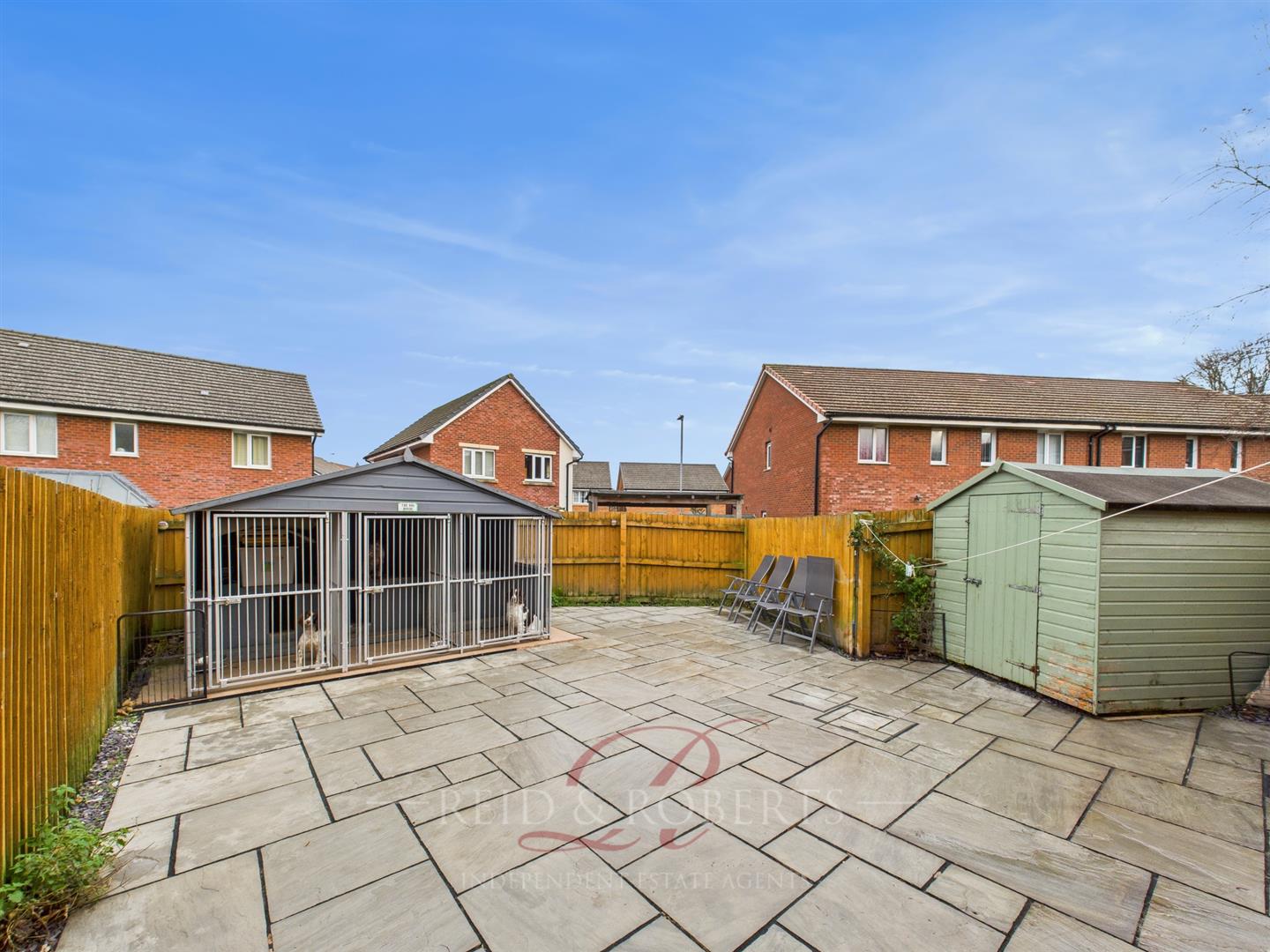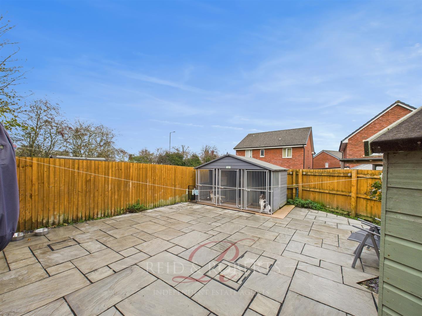 To the rear of the property is a generous, low-maintenance garden predominantly laid with attractive Indian sandstone paving, ideal for outdoor dining, potted plants, and entertaining. A hard-standing area to the side currently houses a large shed, while a larger hard-standing at the rear of the garden is home to dog kennels suitable for three dogs. Slate gravel borders frame the garden neatly, and wood-panel fencing encloses the space on all sides, ensuring privacy and security.