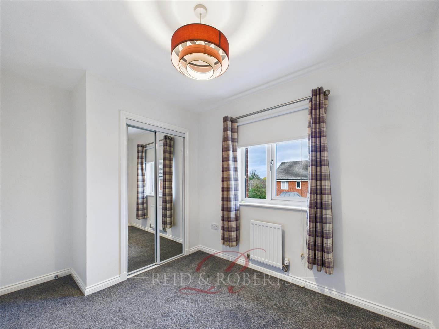 Bedroom two is another generous double bedroom featuring carpeted flooring and a central ceiling light. Built-in wardrobes with mirrored sliding doors offer excellent storage, complete with shelving and hanging rails. A double-glazed UPVC window overlooks the rear garden, creating a peaceful setting.