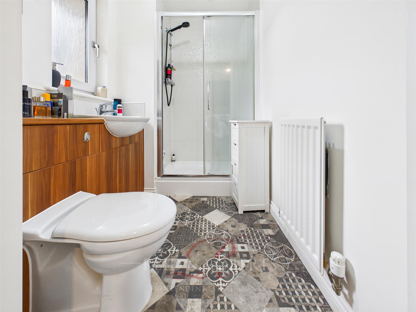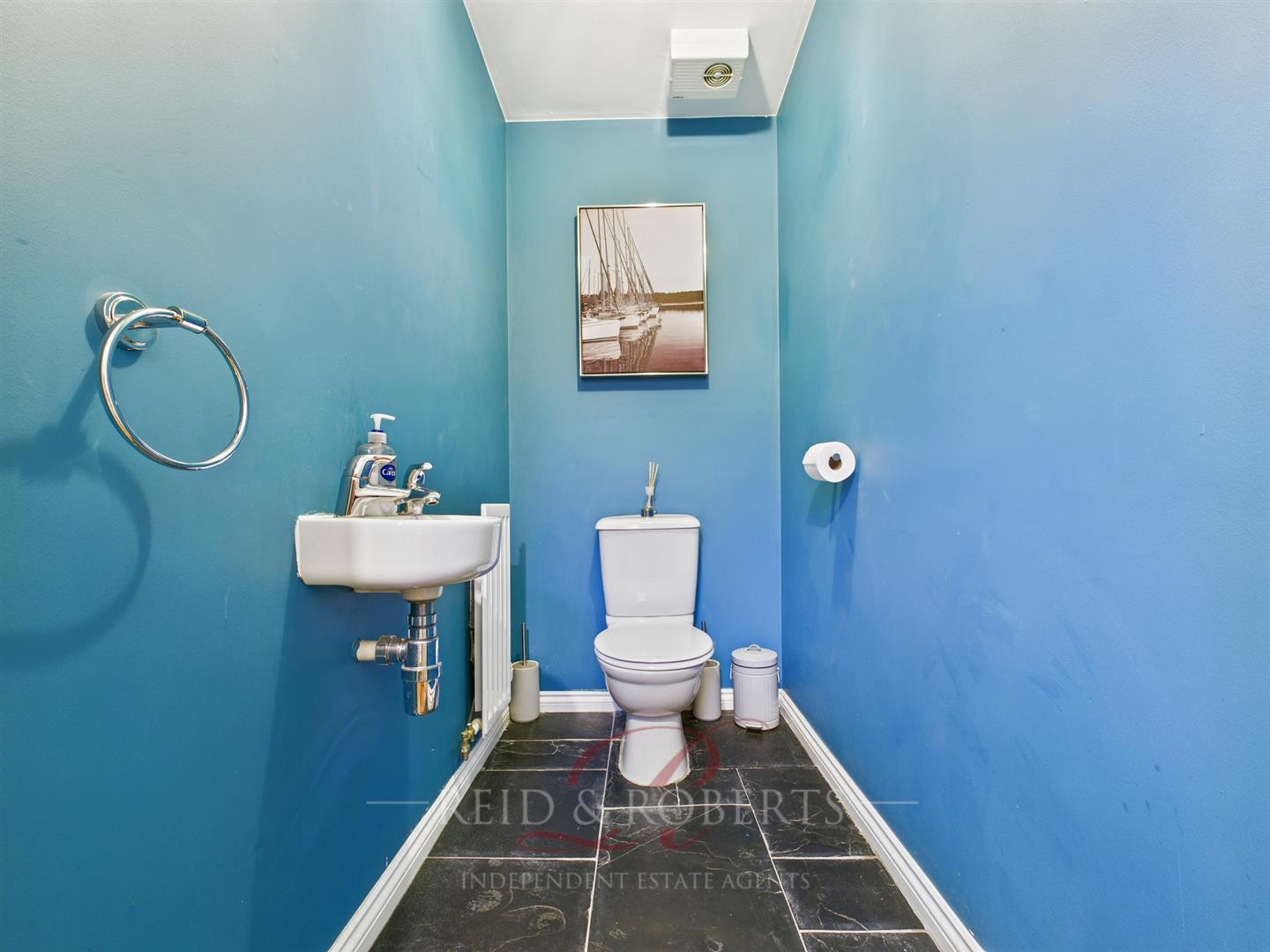 The conveniently located downstairs WC features a modern two-piece suite with a low-flush toilet and wall-mounted wash basin. Tiled flooring adds a neat, low-maintenance finish. The room also includes an extractor fan, central ceiling light, and a single-panel radiator, creating a functional and well-presented space ideal for guests.