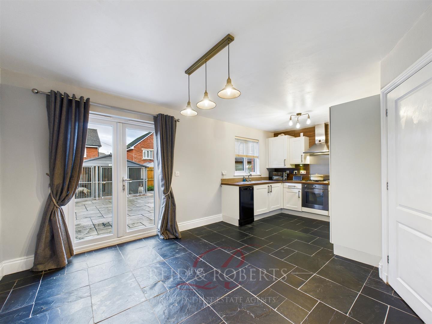 The home’s impressive open-plan kitchen and dining area is both stylish and functional. The kitchen features an attractive range of cream wall and base units topped with wood-effect worktops, complemented by a stainless-steel 1.5 bowl sink with drainer and mixer tap. Appliances include a built-in electric oven, gas hob with stainless-steel splashback, and an extractor hood overhead. There is an integrated fridge freezer and space for a slimline dishwasher, while additional wood-effect splashbacks and a glass upstand add a smart finish. The slate-style tiled flooring continues throughout this space, and a double-panel radiator provides comfort. Lighting includes a central ceiling light in the kitchen and an eye-catching three-drop pendant over the dining area. Double-glazed UPVC French doors open to the rear garden, creating a seamless flow for indoor-outdoor living. A door leads to the under-stairs storage cupboard, which houses plumbing for a washing machine, space for a tumble dryer above, shelving, the electric meter and fuse box, an extractor fan, and a central ceiling light.