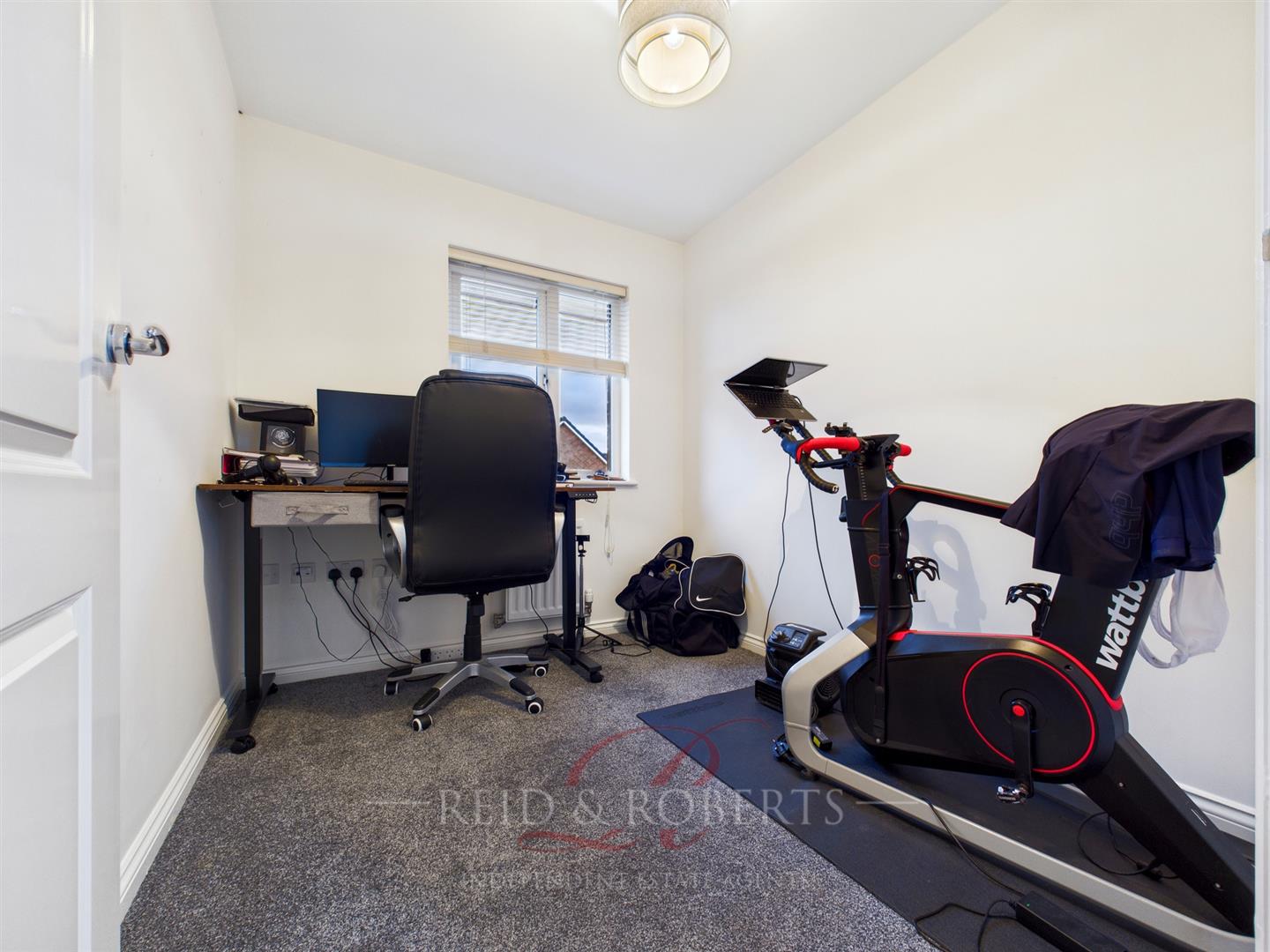 Currently used as an office, bedroom three offers flexibility as a single room, office, nursery, or small double. It features carpeted flooring, a single-panel radiator, a central ceiling light, and a double-glazed UPVC window to the rear elevation, enjoying a quiet outlook.