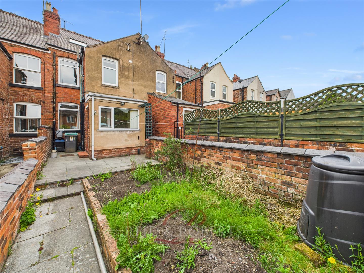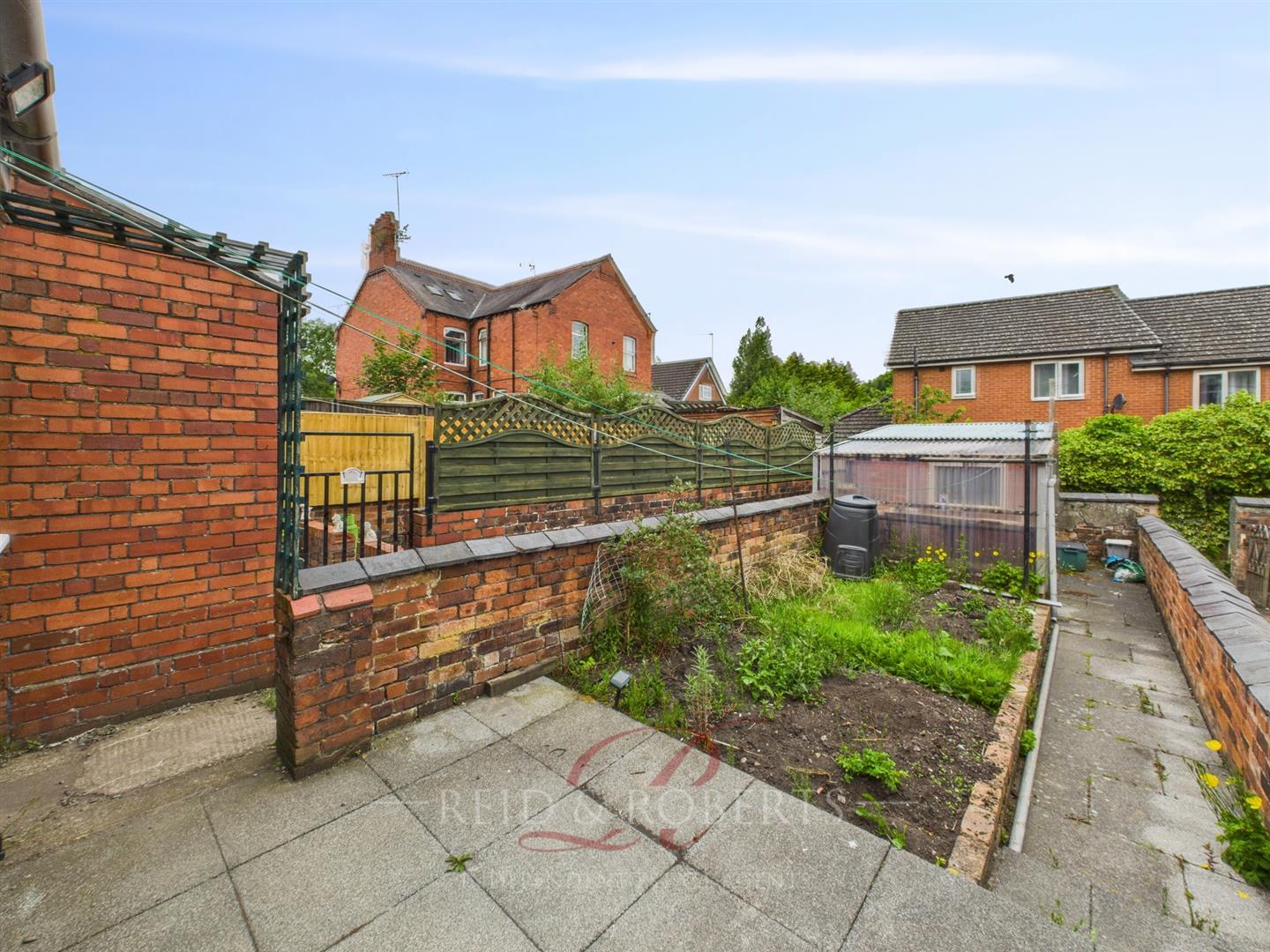 Steps lead down to a stone pathway providing access to a greenhouse and brick-built storage shed with side window. To the rear is a planted section with potential for vegetable growing or garden use. Shared side access returns to the front of the property.