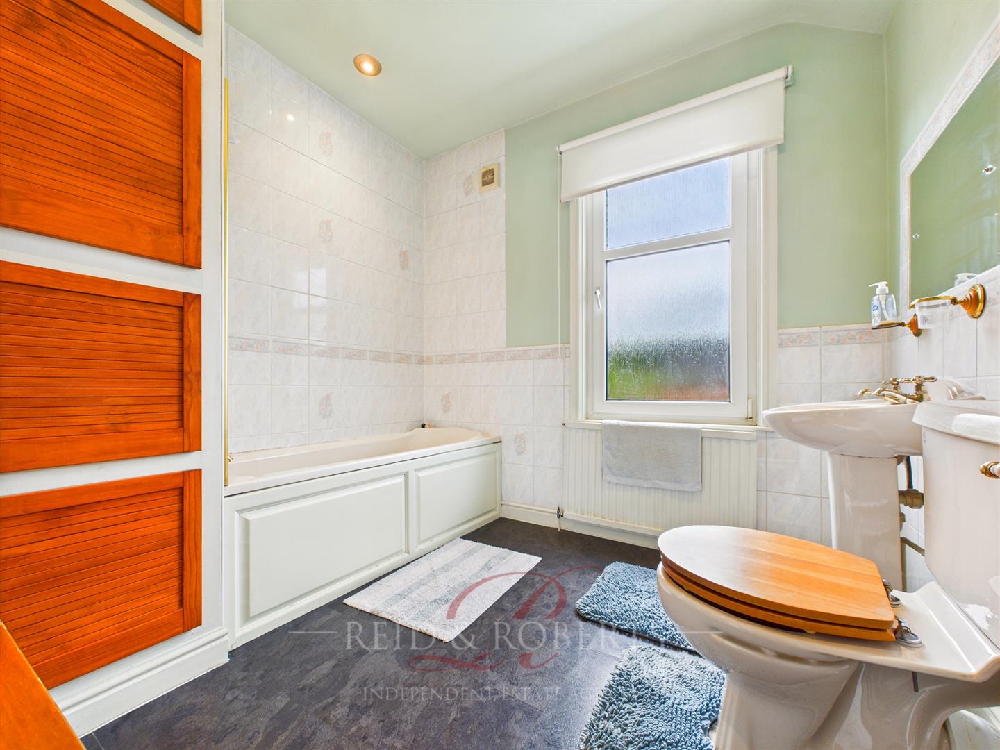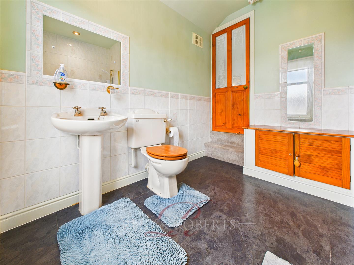 Accessed via steps down from the bedroom. Fitted with a three piece suite comprising low level WC, wash hand basin, and panelled bath with 'Triton' electric shower over. Vinyl tiled effect flooring, UPVC frosted double glazed window to rear elevation, inset spotlights, built in storage cupboard with shelving.