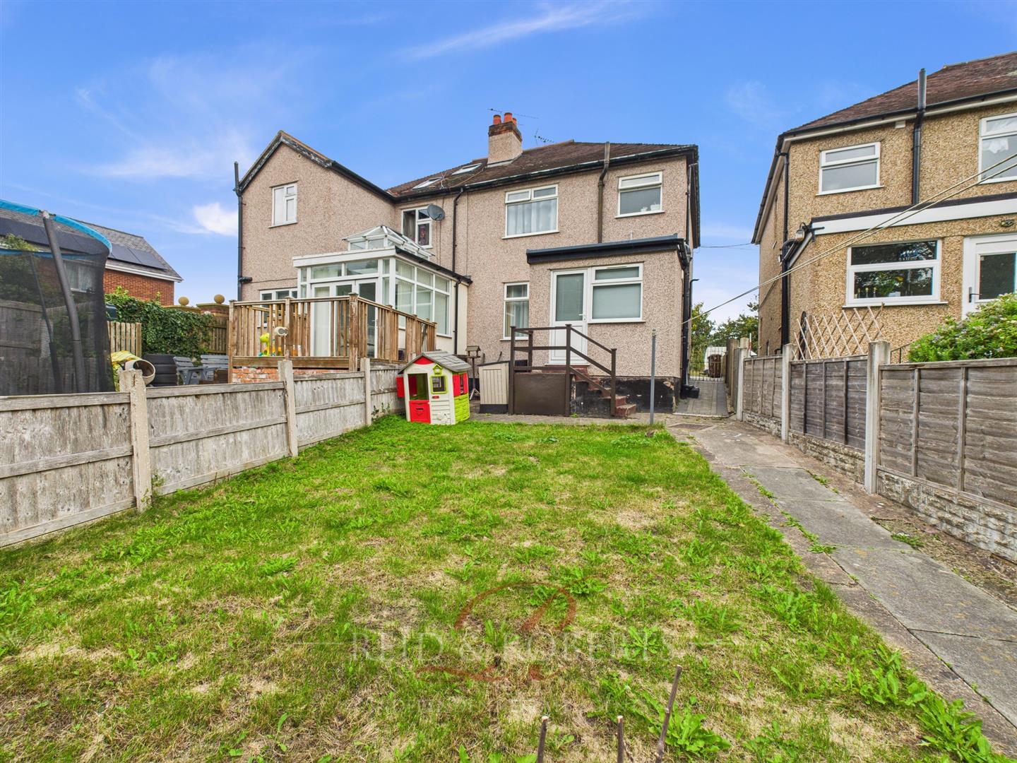 The enclosed rear garden is designed for low-maintenance enjoyment, featuring a laid-to-lawn area with a pathway leading to a shed, ideal for additional outdoor storage. Surrounded by wooden panelled fencing.