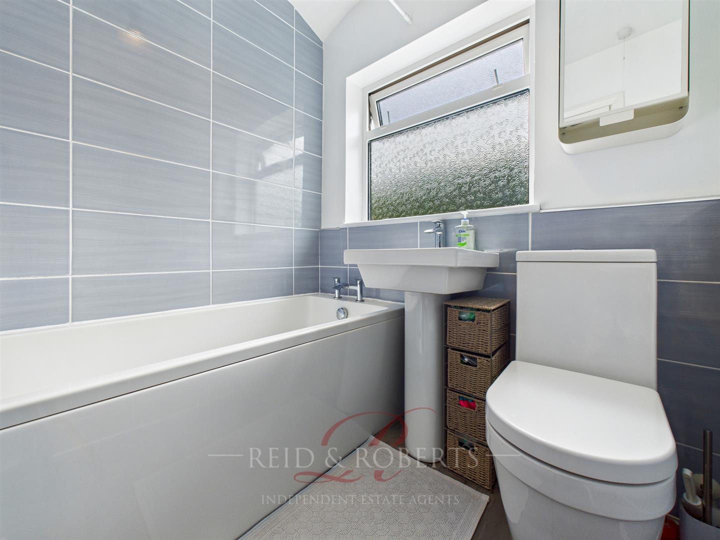 A stylish and contemporary bathroom fitted with a three-piece suite, including a W.C, pedestal sink with mixer tap, and a panelled bath complete with a wall-mounted electric shower. The space is elegantly finished with partially tiled walls and stone effect ceramic tiled flooring, combining practicality with a modern aesthetic. Natural light filters through a UPVC double-glazed frosted window to the rear elevation, ensuring both privacy and brightness, while creating a fresh and inviting atmosphere.