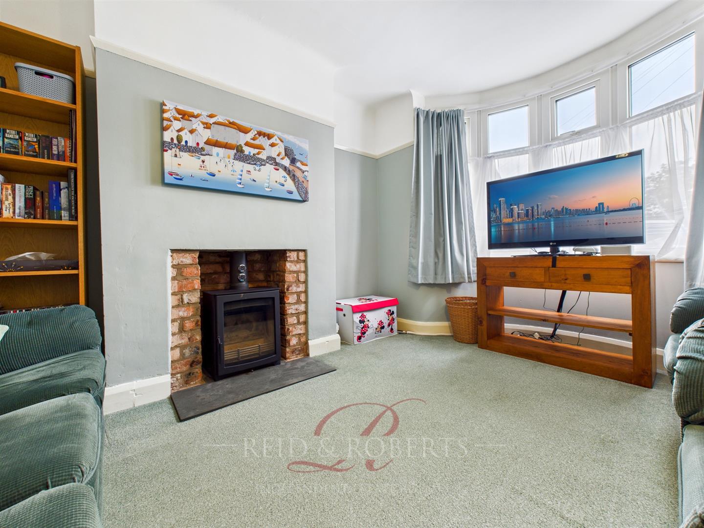 A warm and inviting space with a feature log burner set in exposed brick and on a slate hearth, perfect for cosy evenings. The large UPVC double glazed bay window to the front elevation floods the room with light. Traditional picture rails add character and complemented by a radiator and power points.