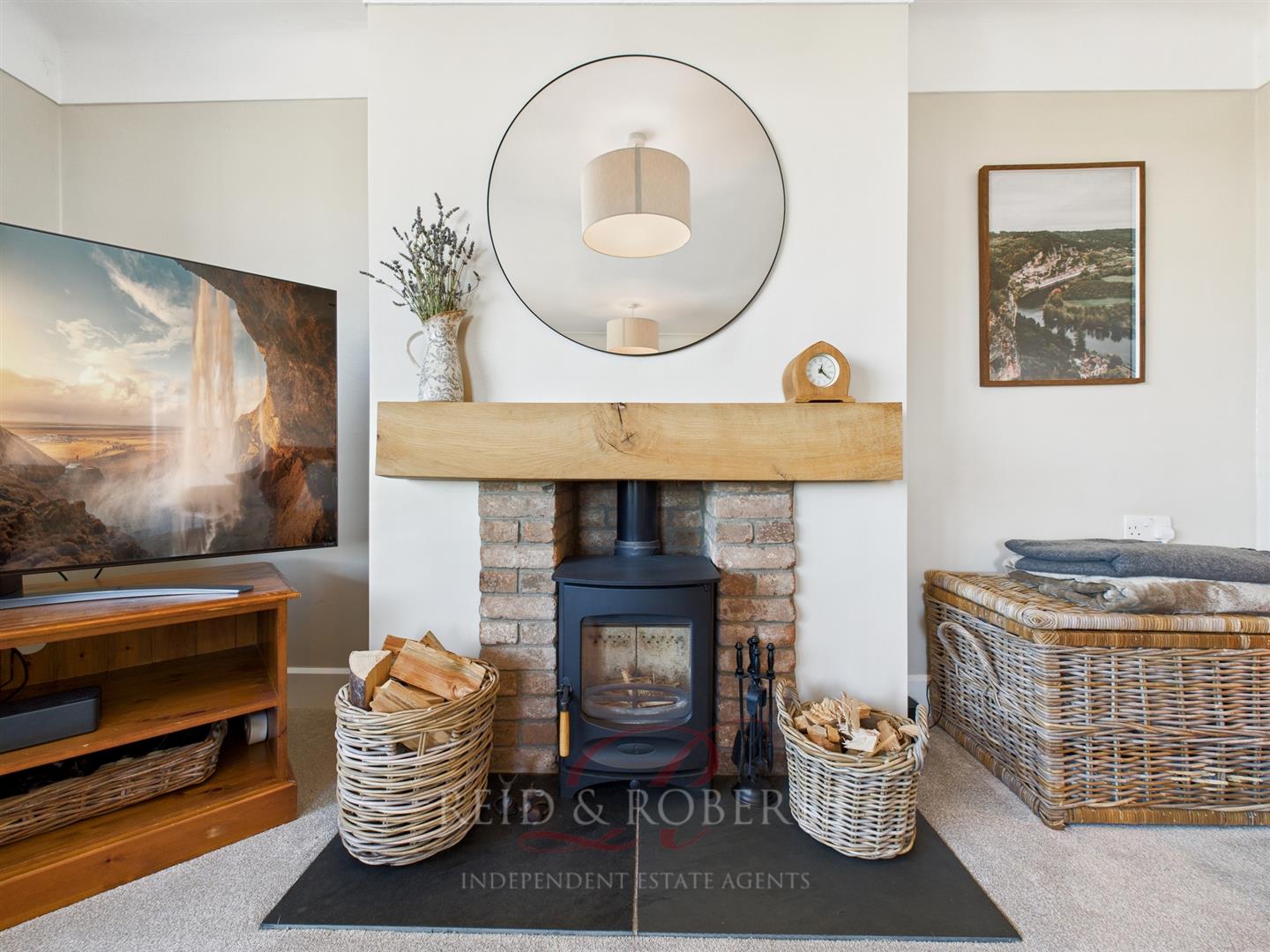 A bright and spacious living room, beautifully styled around a newly installed log burner set on a sleek slate hearth with an elegant wooden mantle, creating a warm and inviting focal point. The space is further complemented by a coved ceiling, radiator, and convenient power points. Dual-aspect UPVC double-glazed windows to the front and side elevations flood the room with natural light and frame stunning views of the estuary and surrounding countryside. Perfect for relaxing, unwinding, or entertaining in comfort and style.