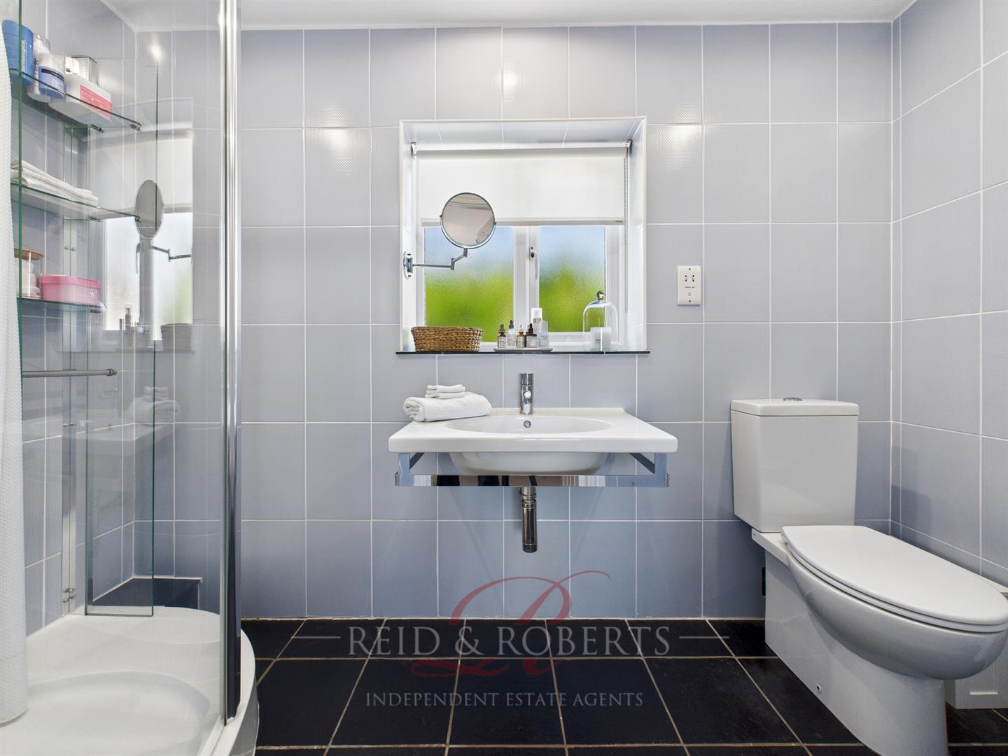 The spacious En-Suite is fitted with a stylish three-piece suite, comprising a low-flush W.C, wall-mounted sink with mixer tap, and a fully tiled double corner shower cubicle with mains-powered shower and adjustable head. Further features include a wall-mounted heated towel rail, fully tiled walls and flooring, inset downlights, and a UPVC double-glazed frosted window to the rear elevation.