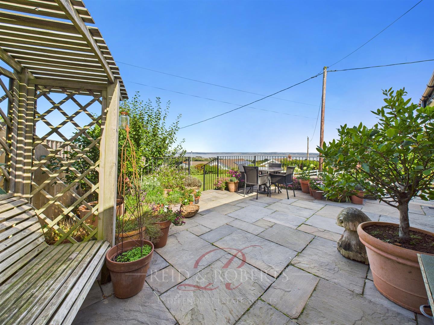 Externally, the property continues to impress. From the kitchen / diner doors open onto a private patio terrace, the perfect spot to enjoy uninterrupted estuary views. Steps lead down to a large, neatly lawned garden with mature shrub borders and a useful storage shed. To the rear, a separate enclosed paved patio creates an ideal space for alfresco dining and entertaining, with gated access linking back to the side garden and to the front of the property.