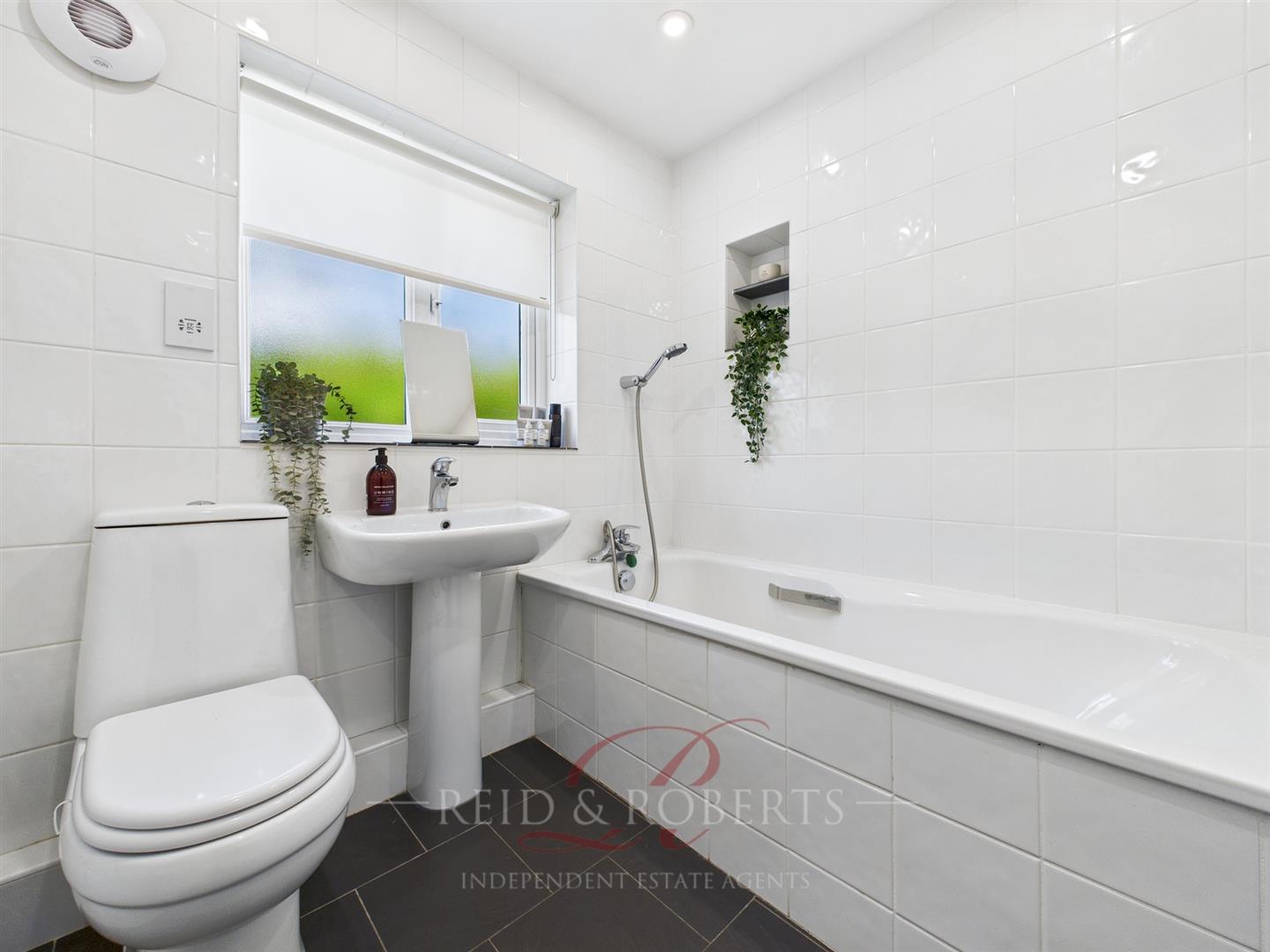 The contemporary family bathroom features a stylish three-piece suite comprising a low-flush W.C., pedestal wash basin with mixer tap, and a tiled bath with mixer tap and shower head attachment. Designed for both comfort and practicality, the space is finished with fully tiled walls and flooring for ease of maintenance, complemented by a wall-mounted heated towel rail, extractor fan, inset downlights, and a UPVC double-glazed frosted window to the rear elevation, providing natural light while maintaining privacy.