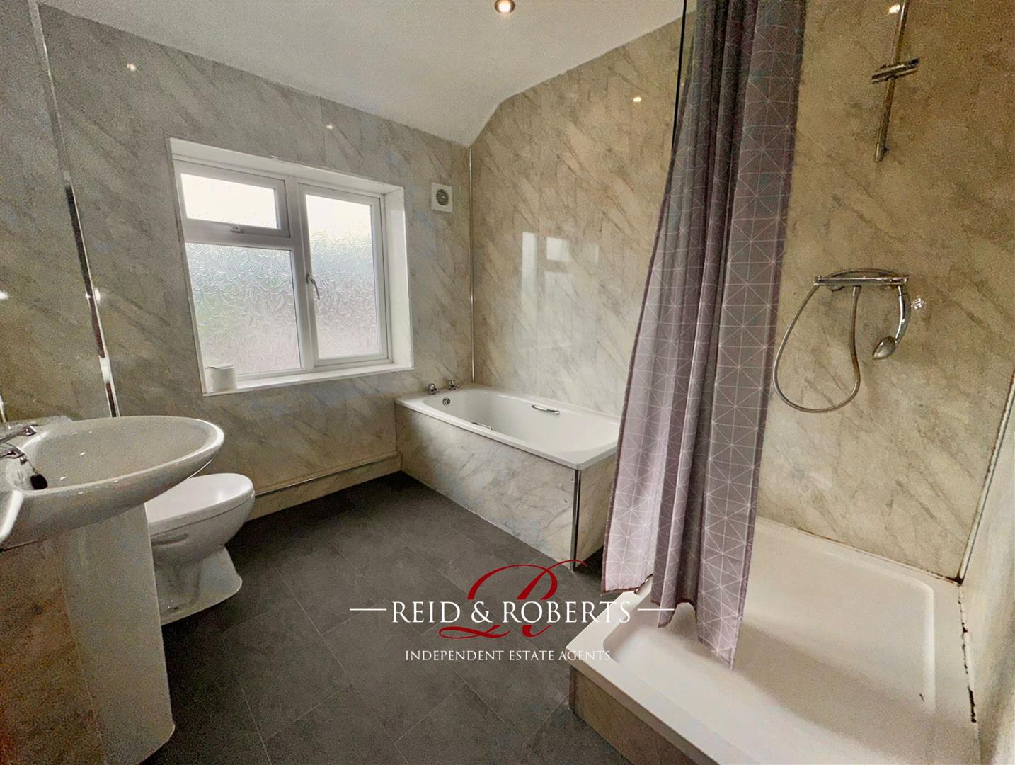 Three piece suite comprising of a bath with mixer tap over, low flush W.C and pedestal sink unit. Fully tiled walls, double panelled radiator, fixed mirror and shaver socket. Double glazed frosted window to the side elevation.