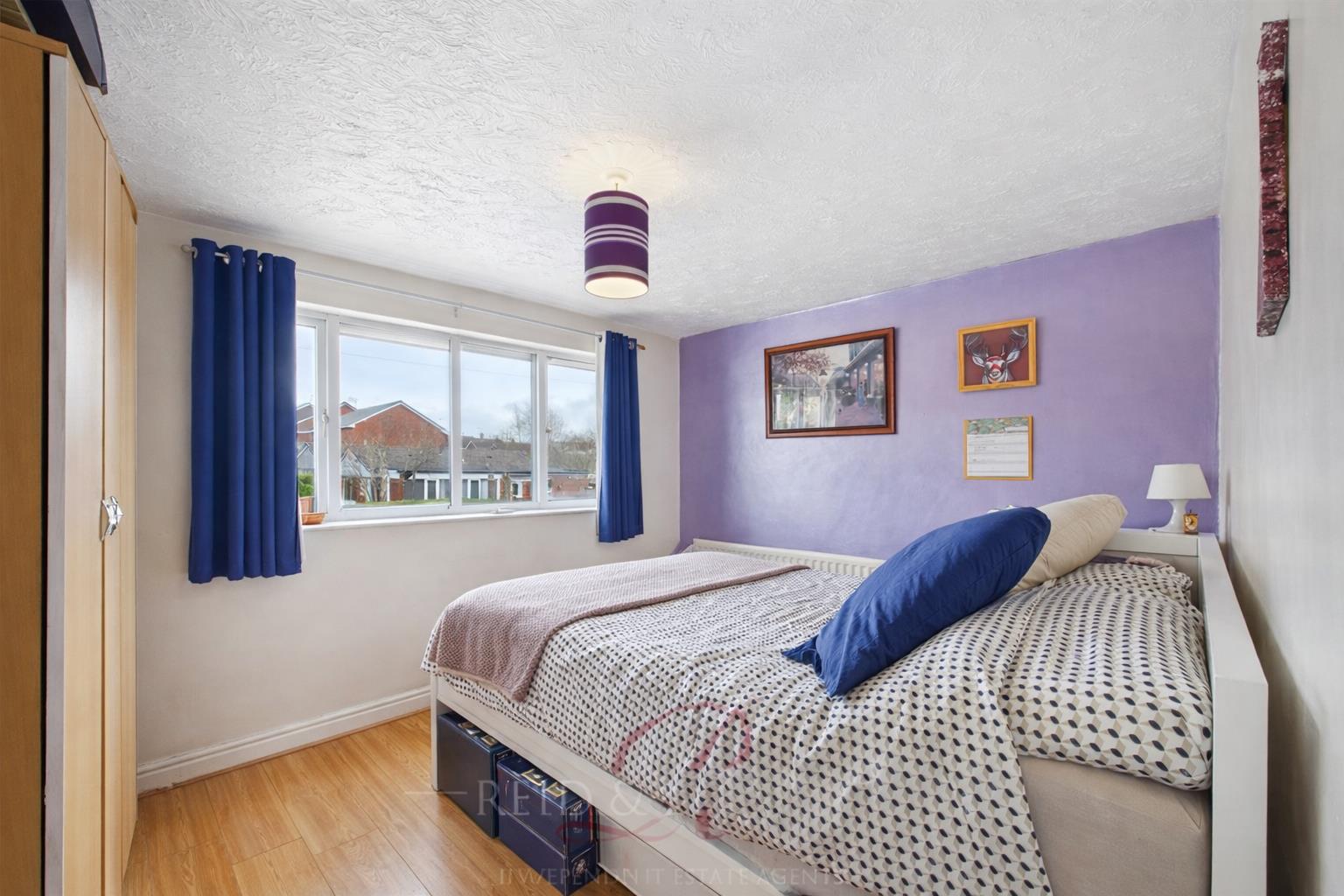 The principal bedroom is a generous double room offering plenty of space for a large bed as well as additional furniture such as wardrobes and storage. The room features wood-effect laminate flooring, a double panelled radiator, textured ceilings with ceiling light, and a large double glazed UPVC window to the front elevation which allows excellent natural light into the room.