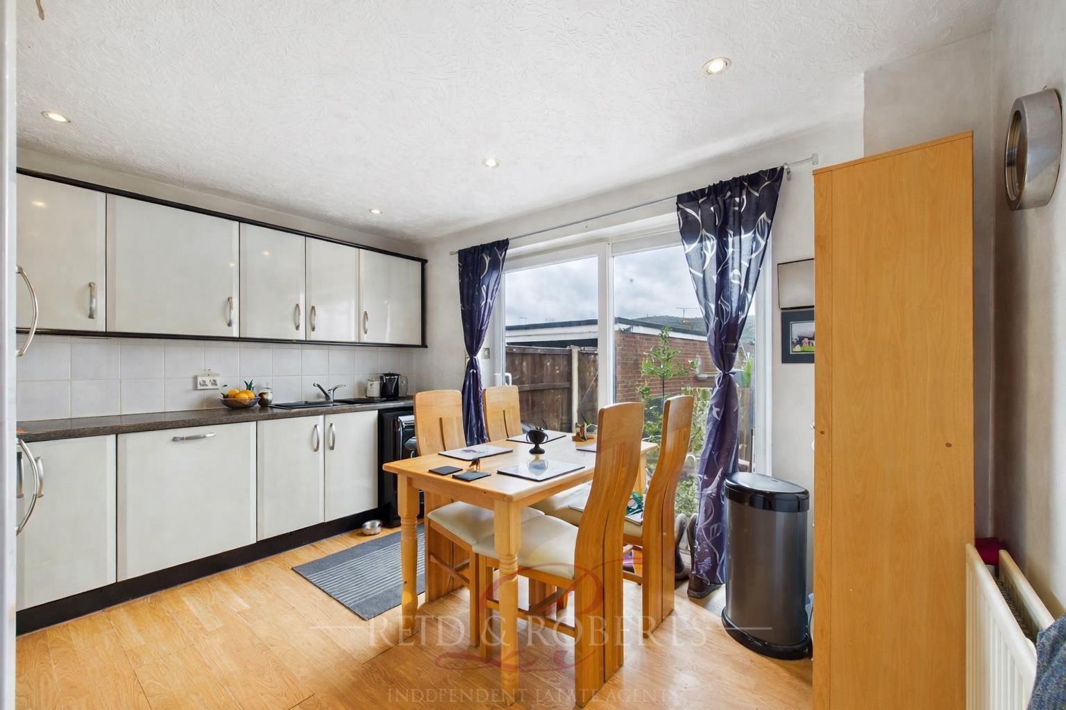 The kitchen is fitted with a range of modern high gloss wall and base units with complementary worktops over, providing ample storage and preparation space. Incorporated within the worktops is a stainless steel one and a half bowl sink unit with mixer tap and drainer. The kitchen benefits from a range of integrated appliances including a built-in electric oven and grill, a four-ring gas hob with splashback tiling and extractor hood over, an integrated fridge freezer, and an integrated dishwasher. The room features wood-effect laminate flooring and a textured ceiling with inset spotlights, creating a bright and practical space for cooking and dining. Designed as a kitchen dining room, the space comfortably accommodates a dining table and chairs, making it ideal for everyday family meals or entertaining guests.