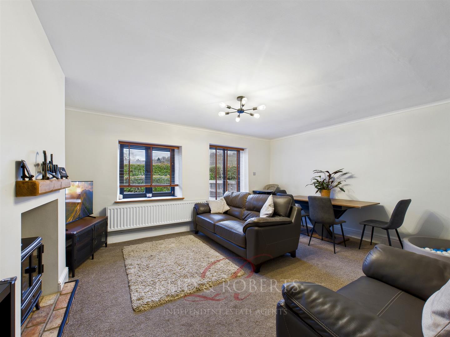 The lounge is a warm and versatile room with a log-effect electric fireplace set on a brick hearth with an inset oak beam. Currently used as a multifunctional space, it comfortably accommodates seating and a dining area and could also double as a playroom. Cove ceiling, wall lights, and a large picture window to the front bring charm and light into the room.