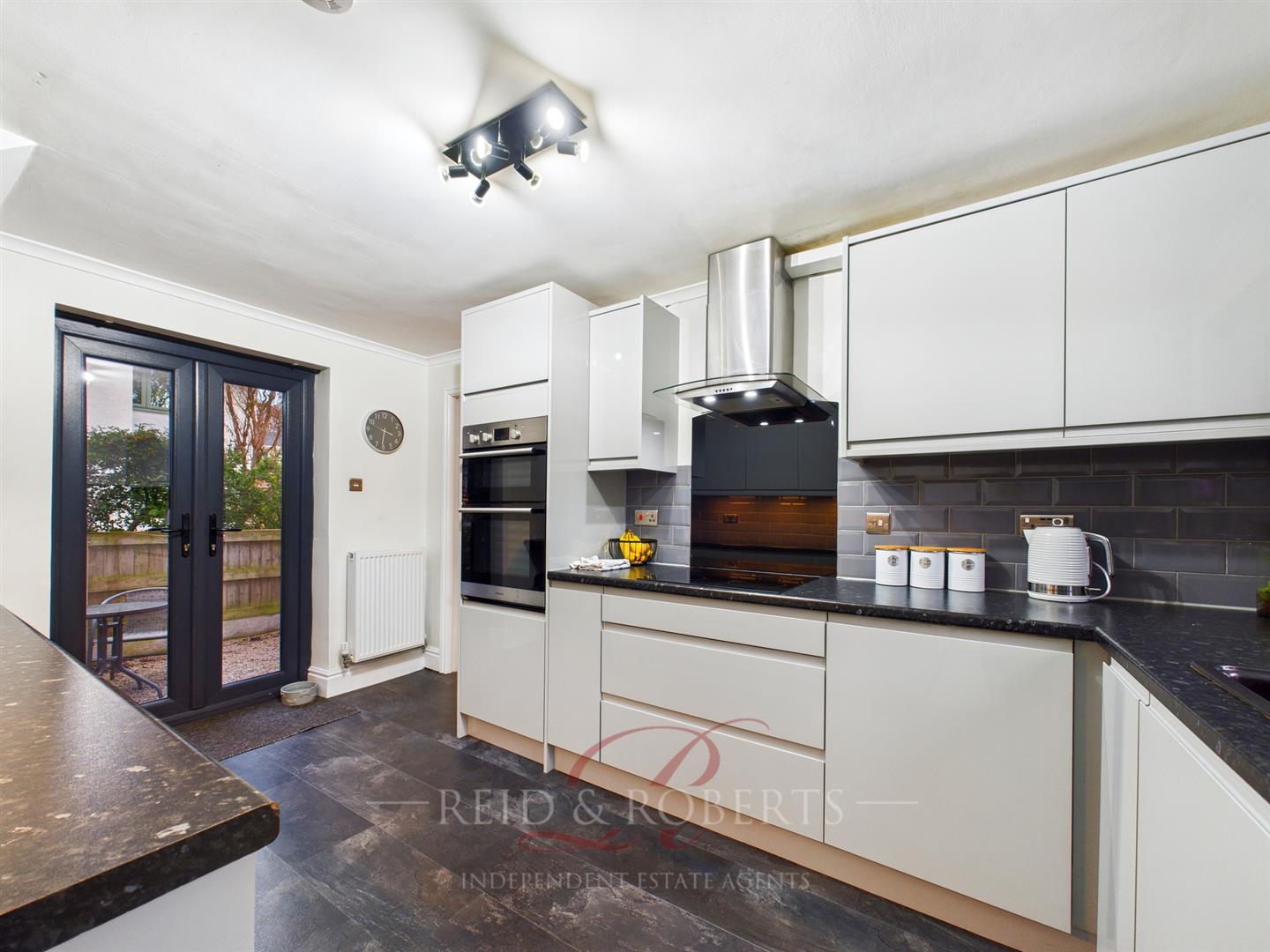 The kitchen is modern and practical, with light grey high-gloss wall and base units, granite-effect worktops, and a composite sink with black mixer tap. There is a full-ring induction hob, built-in oven, and integrated under-counter fridge. The room offers ample workspace and under-stairs storage and flows seamlessly via French doors to the side of the property, connecting the interior with the outdoor space.