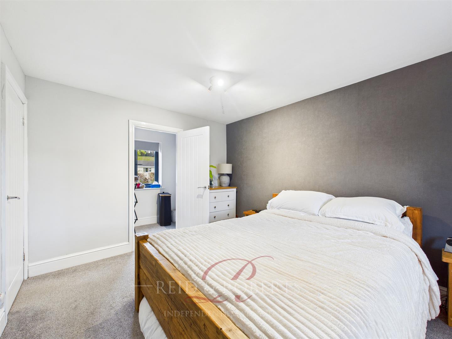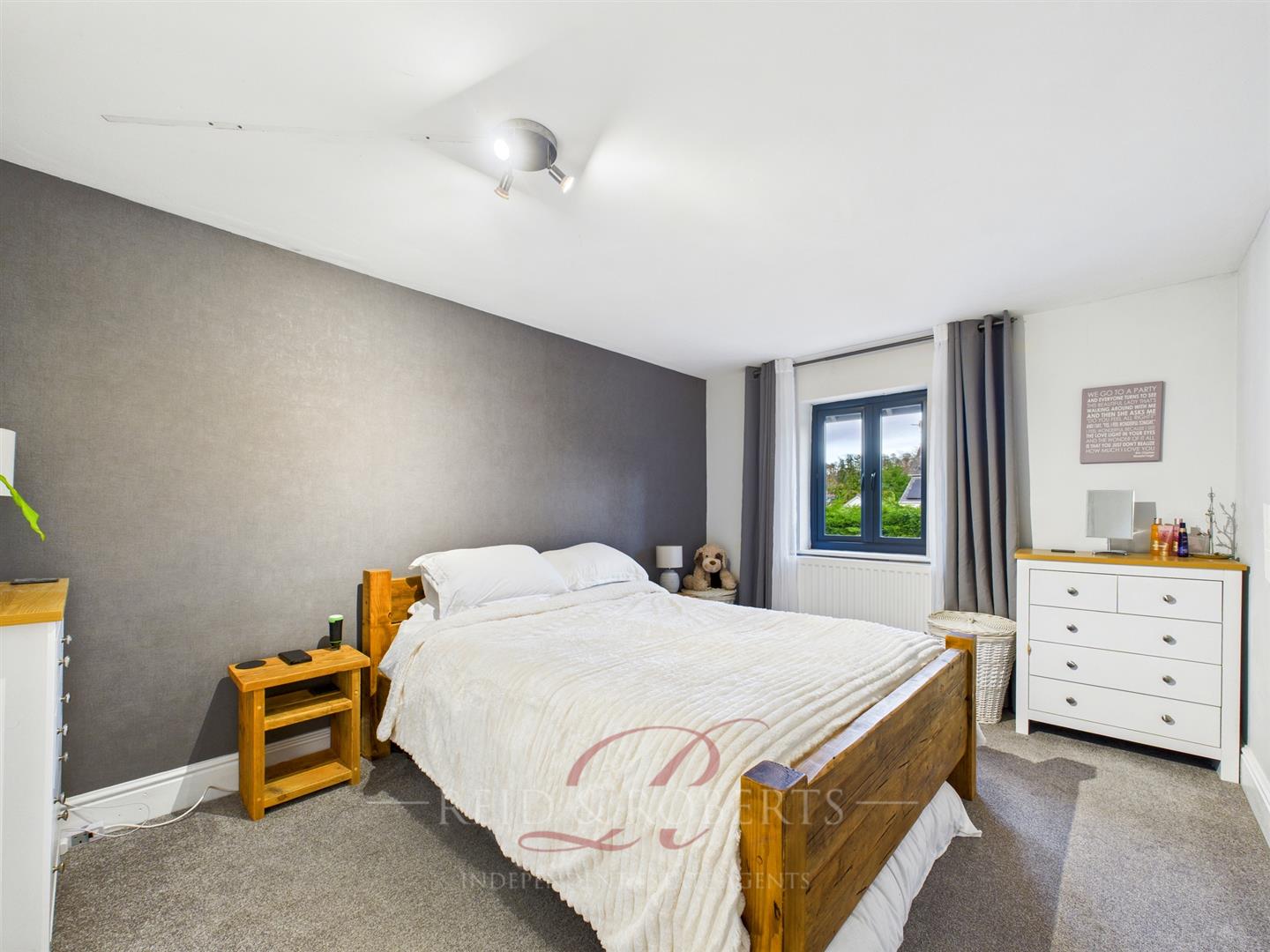 Bedroom Two is a generous double, easily accommodating a king-size bed. It features built-in wardrobe storage and a panelled feature wall, making it a versatile room for family, guests, or a home office.