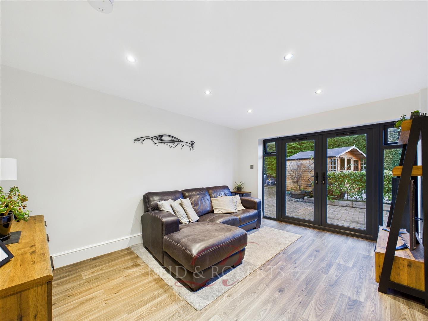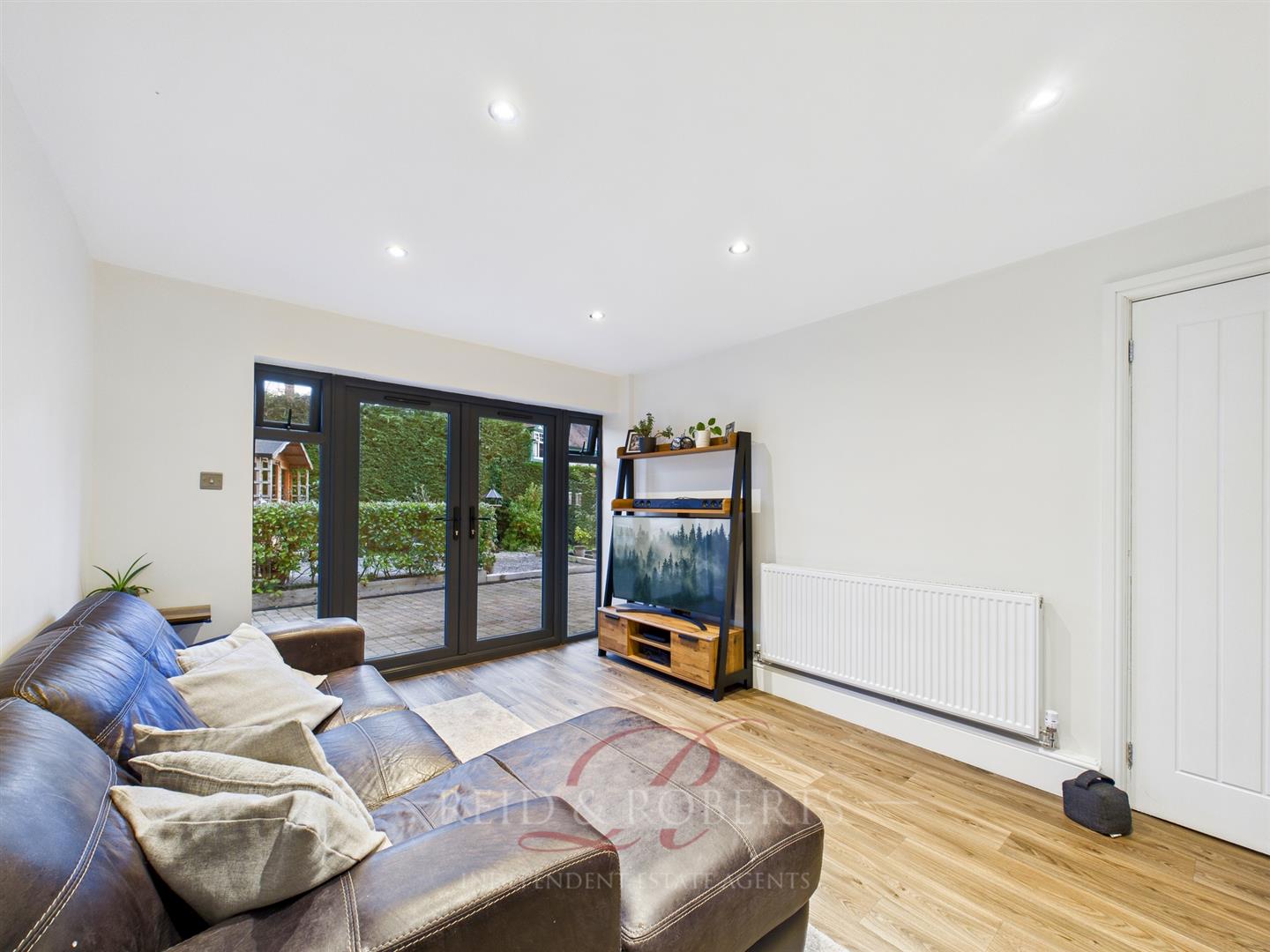 This recently converted garage has been transformed into a contemporary snug, providing a flexible space ideal as a family room, dining area, playroom, games room, or even a downstairs bedroom. Anthracite French doors open directly to the driveway, creating a bright, airy space that links indoor and outdoor living.