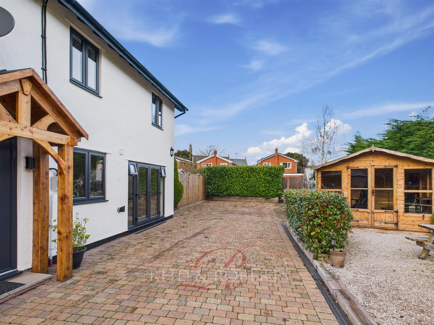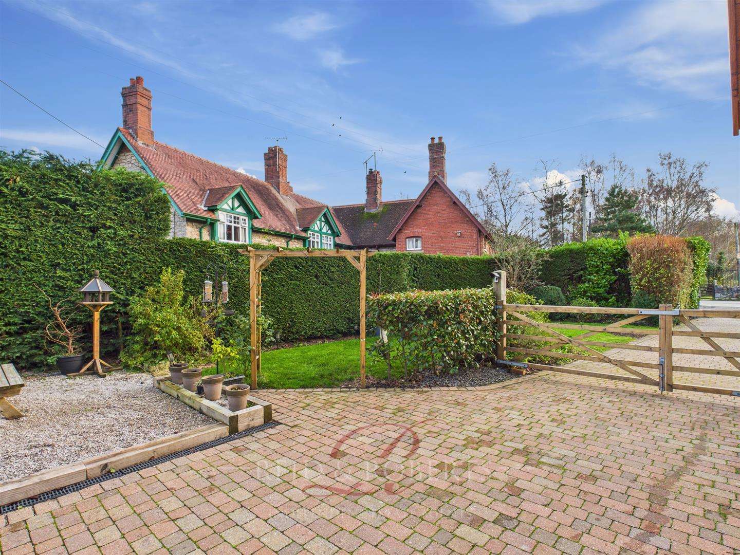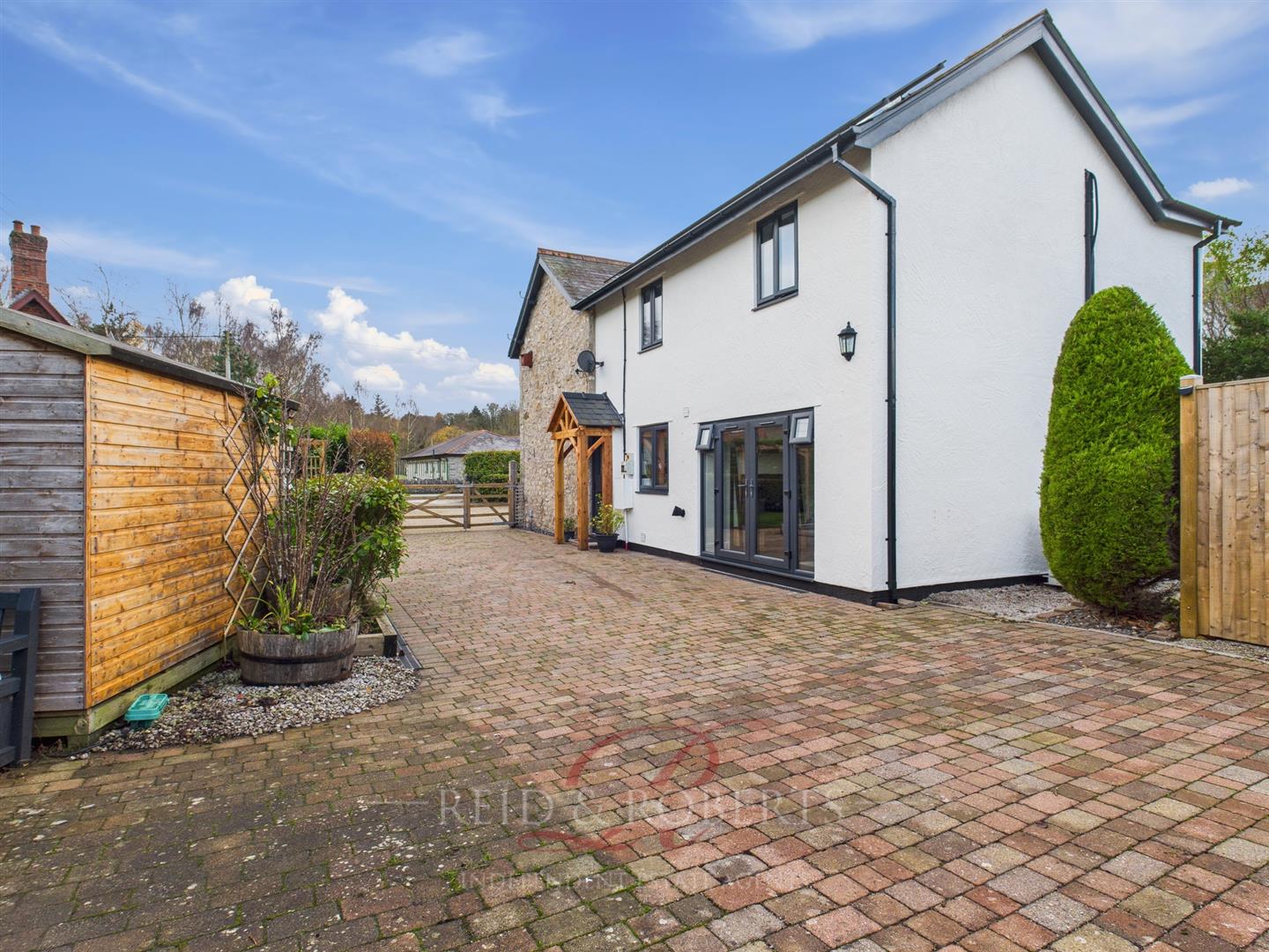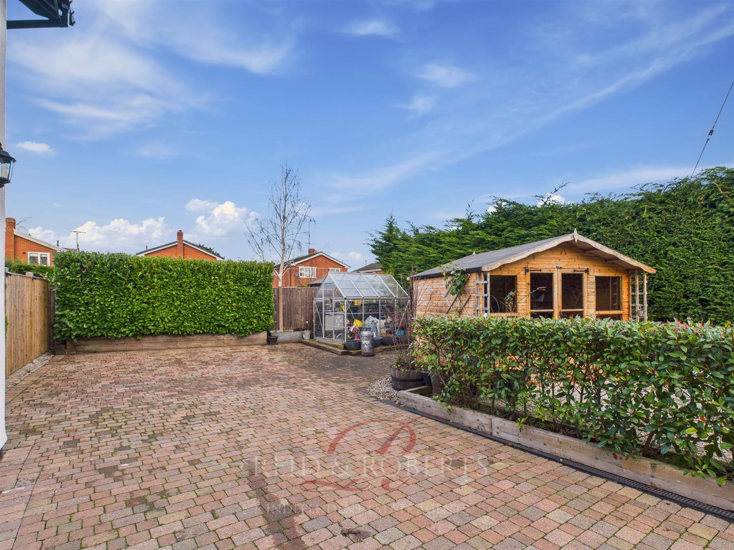 The property offers significant outdoor space with multiple block-paved parking areas for six to eight cars, a main lawned garden, a gravelled seating area, mature shrubs, and fruit trees. There is a wooden outhouse currently used as an office, additional hardstanding areas with a plastic greenhouse (included in the sale and safe for use) alongside raised beds, and a rear storage area with sheds and a shared CamGas tank. A quaint side seating area completes the outdoor space, providing both practicality and charm.