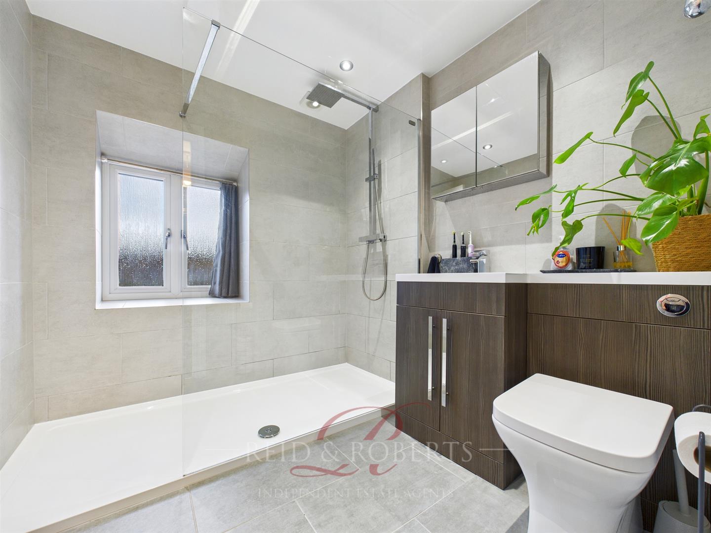 The family bathroom is beautifully modern, featuring a three-piece suite with a walk-in double shower, vanity storage, and fully tiled walls and floor. Spotlights and a frosted window complete this contemporary space.