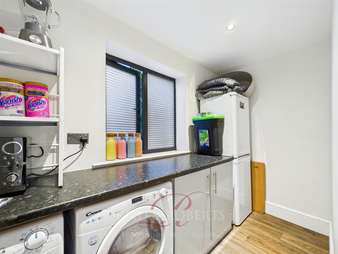 The utility area includes a granite-effect worktop, under-counter storage, space for washing machine and tumble dryer, and room for a large fridge freezer. This practical space is ideal for household storage and daily chores, helping keep the main living areas clutter-free.