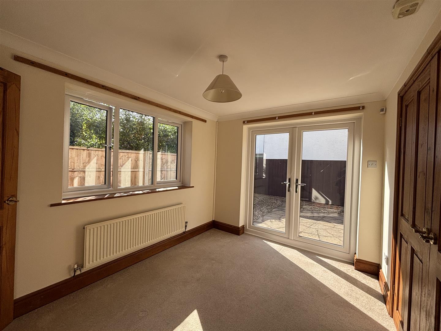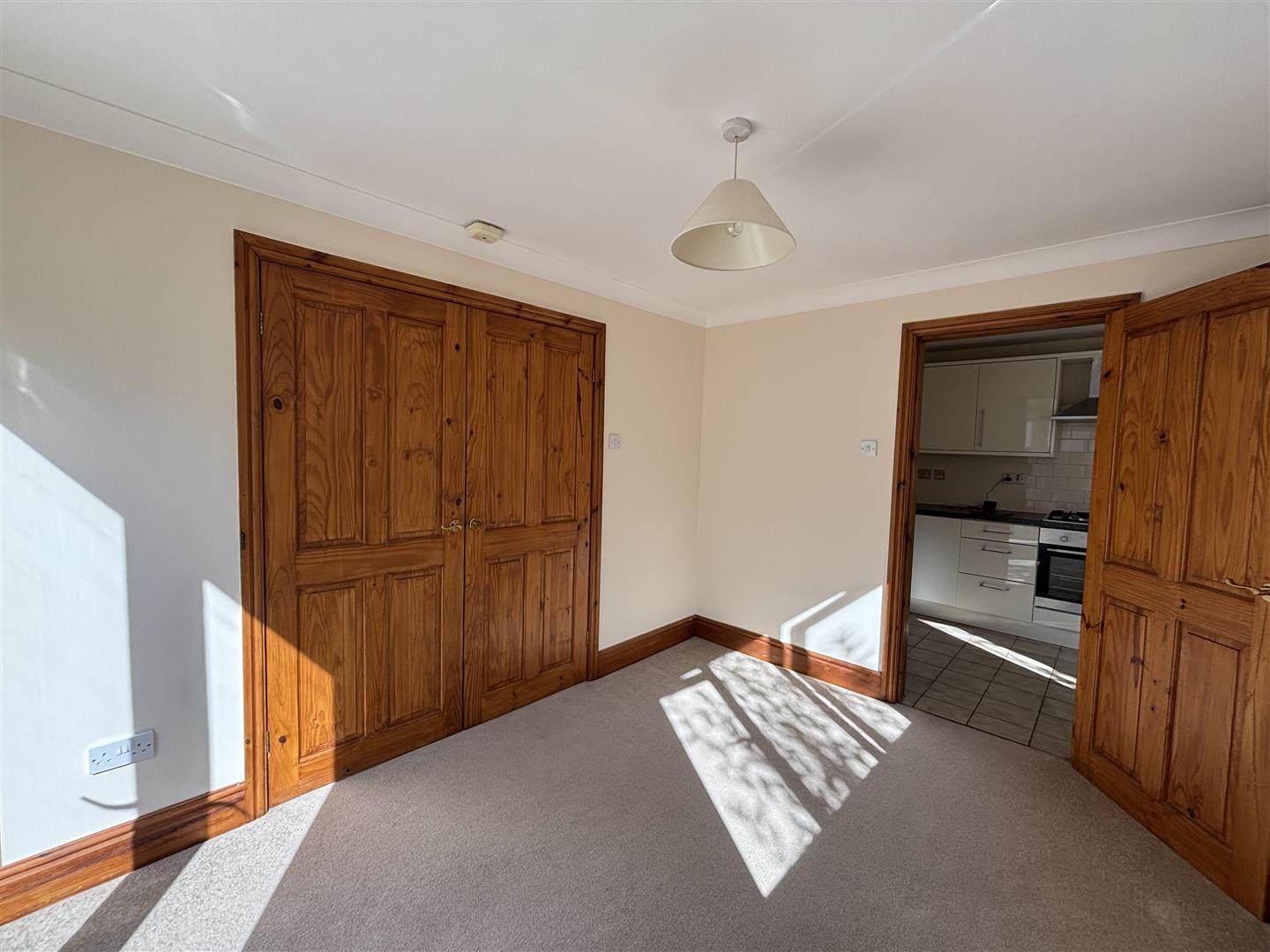 The accommodation briefly comprises a bright and spacious living room with double doors opening into a separate dining room, which enjoys French doors leading out to a private patio area. The modern fitted kitchen is well-equipped with an integrated oven, hob, fridge, and freezer, and offers ample space for daily use.