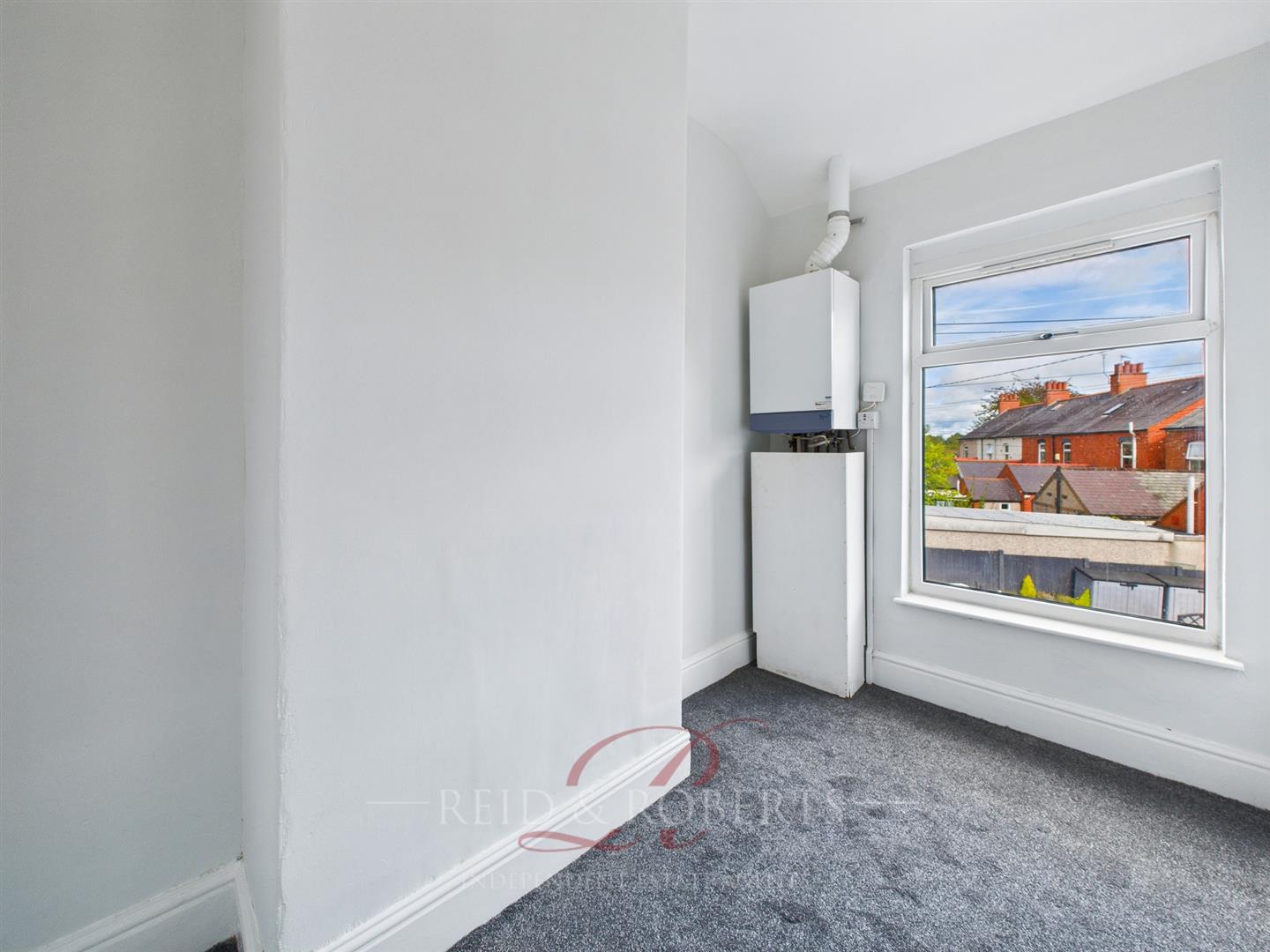 UPVC double glazed window to the rear elevation, wall-mounted Potterton boiler, panelled radiator, ceiling light point, and carpet flooring.